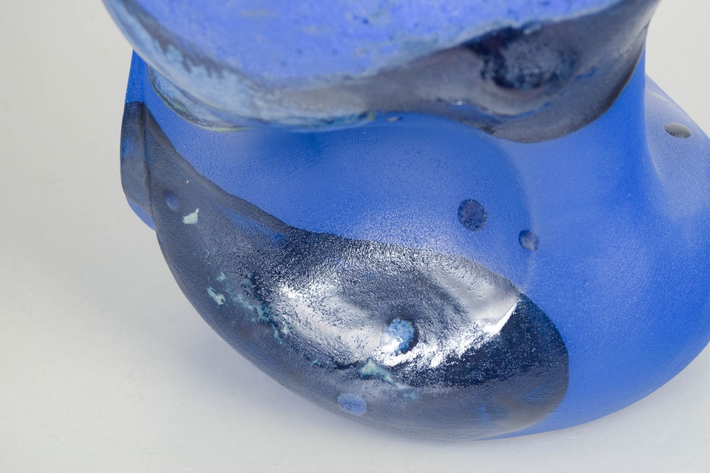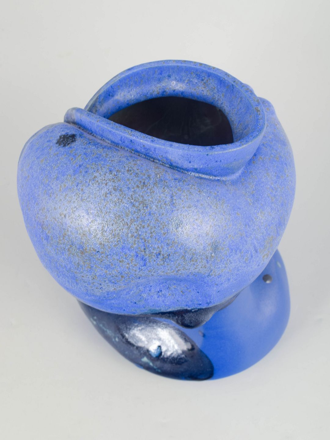 Large hand modeled, organic shaped, vessel. The vessel is covered in a variety of royal blue glazes, matte and shiny.