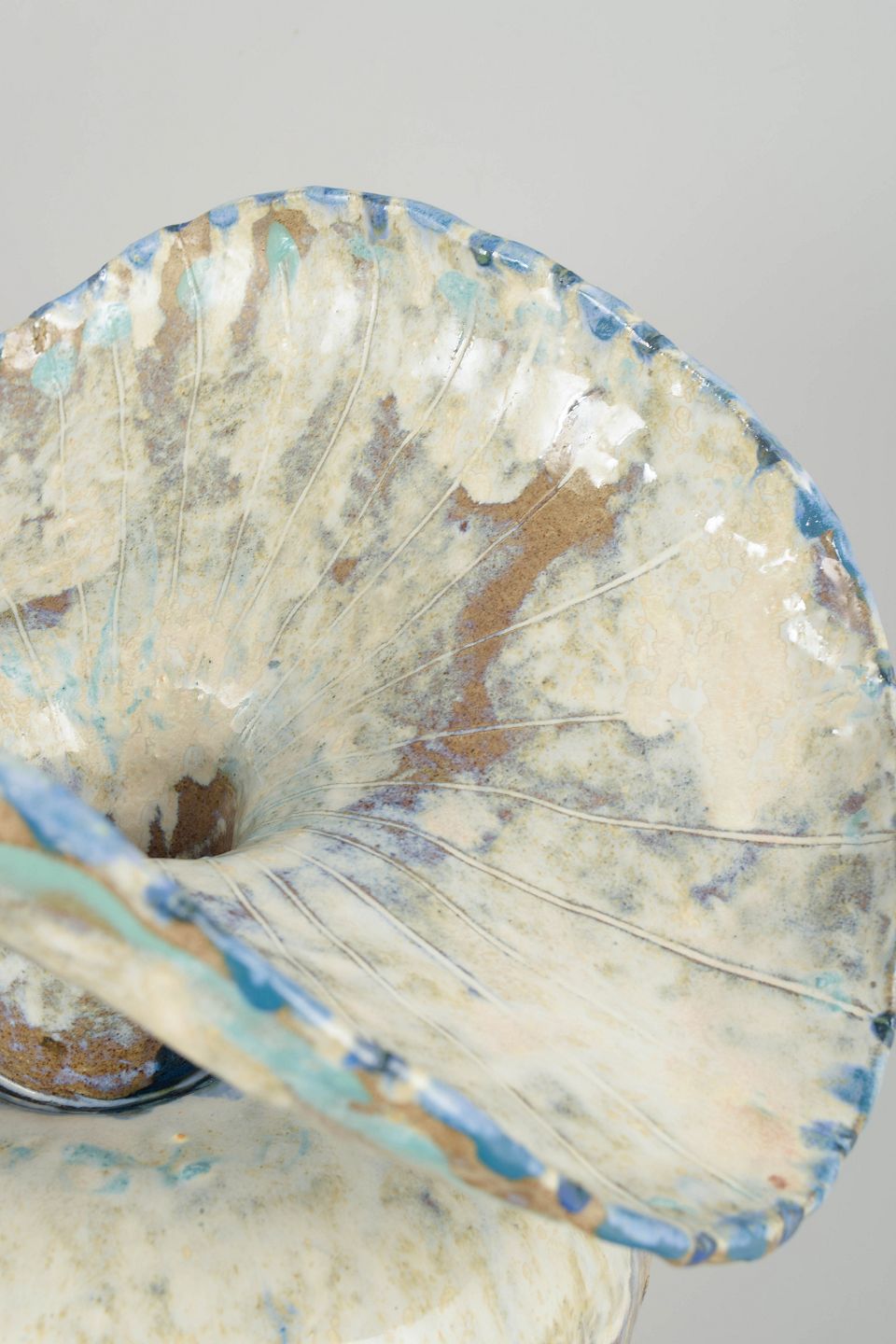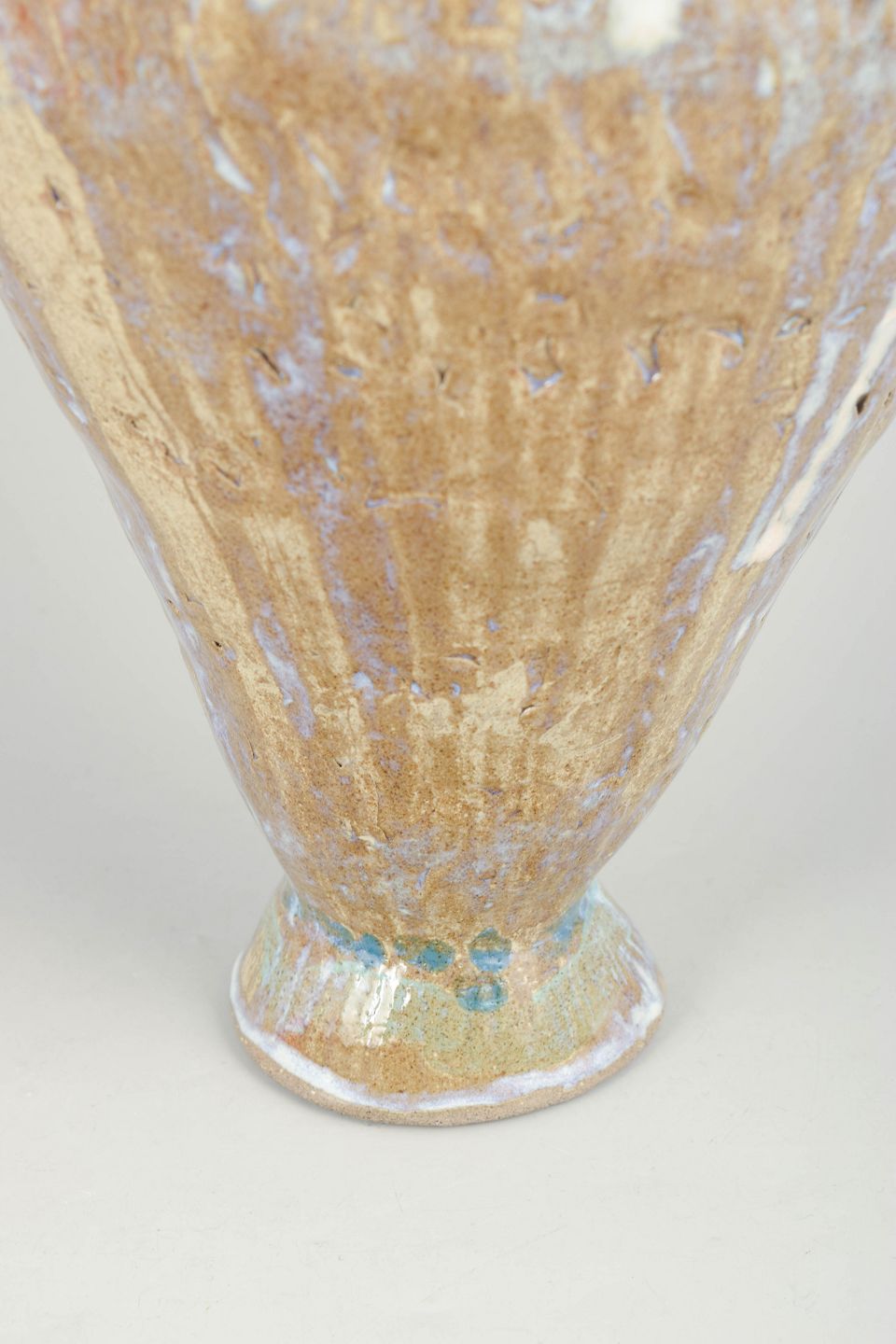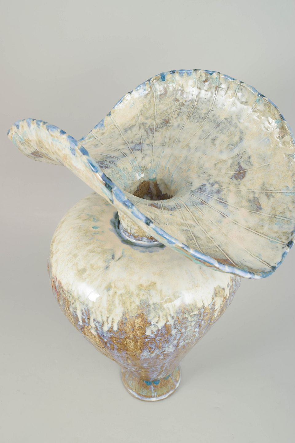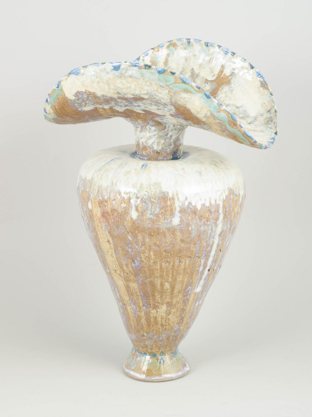 Very large hand modeled, organic shaped, vessel. The vessel is covered in cream and brown glaze with blue hues..