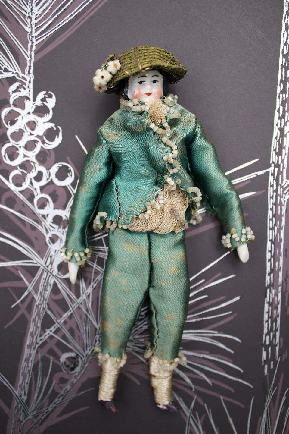 1) H: 19cm. Lady with head, hands and feet in porcelain, body in fabric and dressed in old silk clothes and hat. - PRICE: 700 DKK.