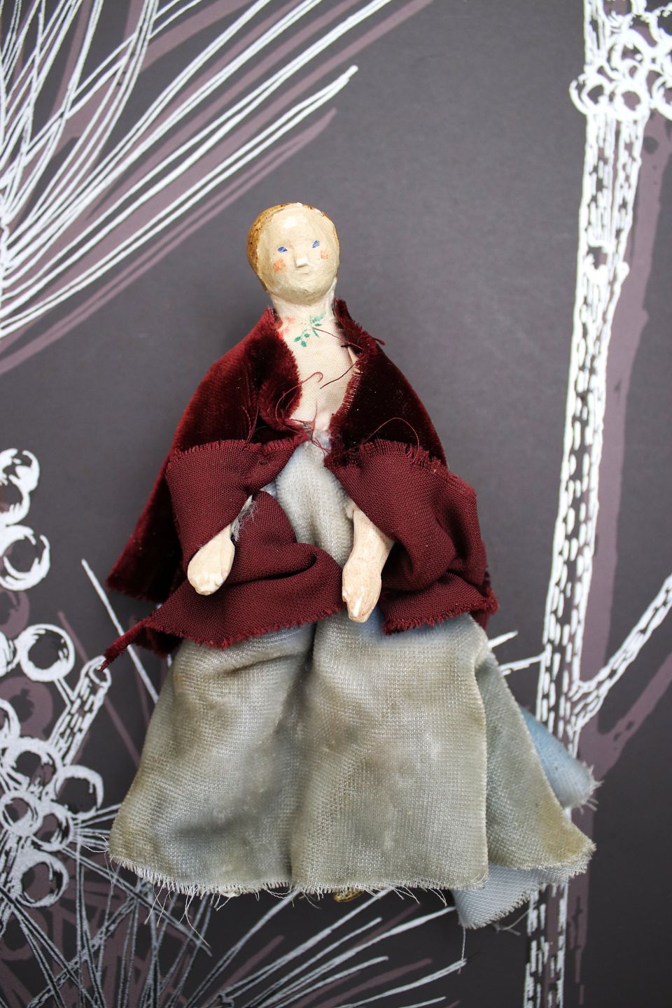 3) H: 14cm. Woman Lady with head, hands and feet in wood, body in fabric and dressed in old velour clothes. - PRICE: 300 DKK.
