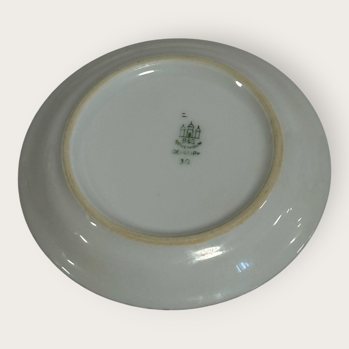 Bing & Grondahl, Aakjær, White porcelain with gold rim, small dish # 30, 9.5cm in diameter, 1st grade *Good condition*