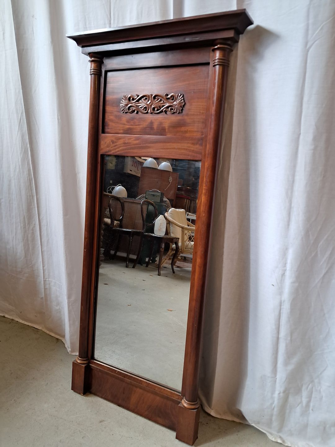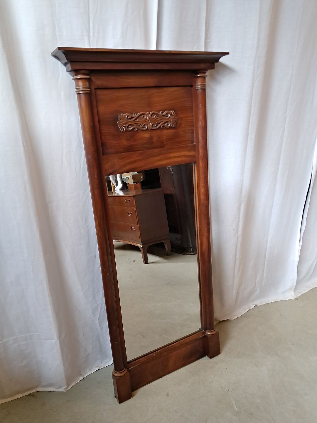 Spejl i fineret mahogni, fra 1900erne.