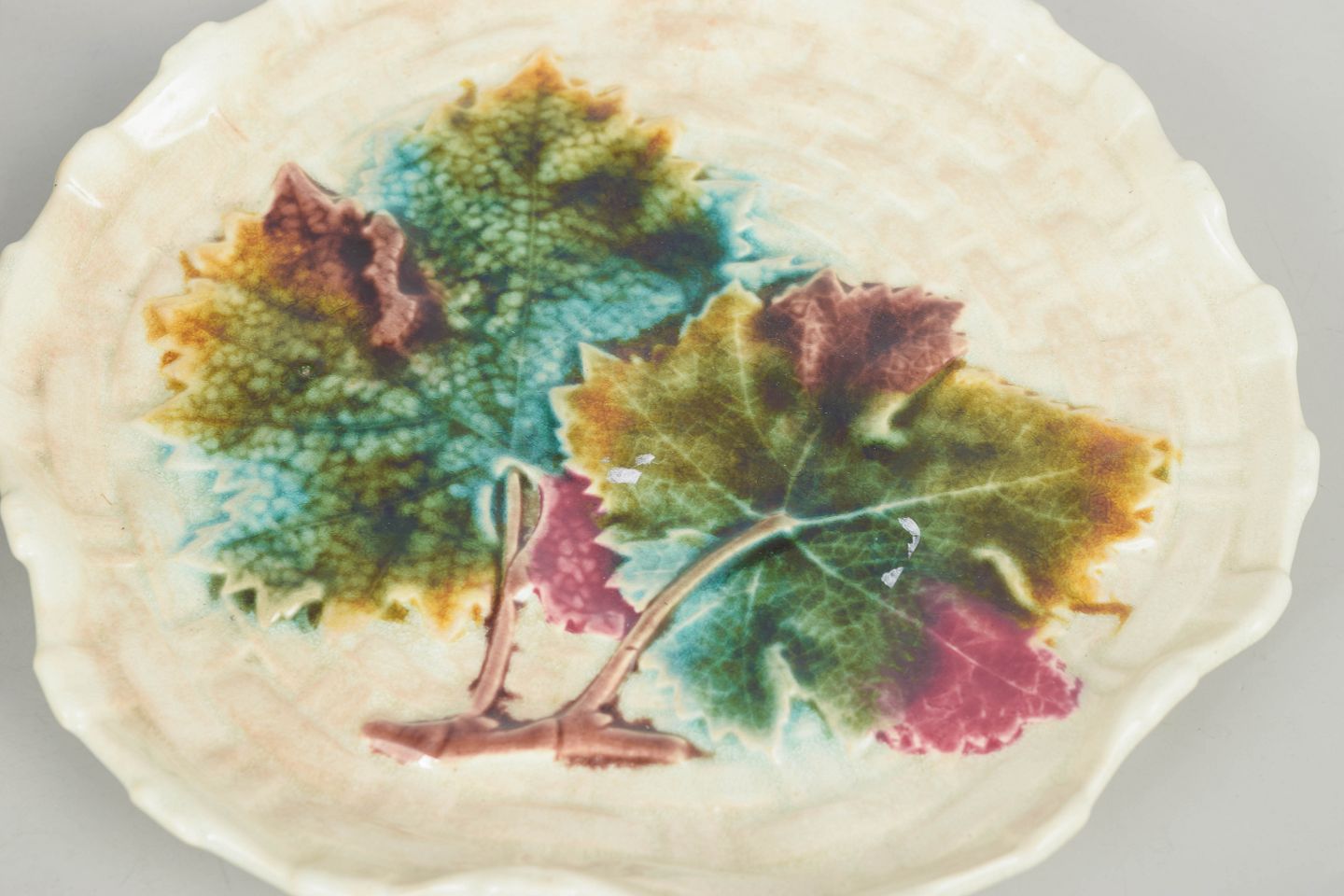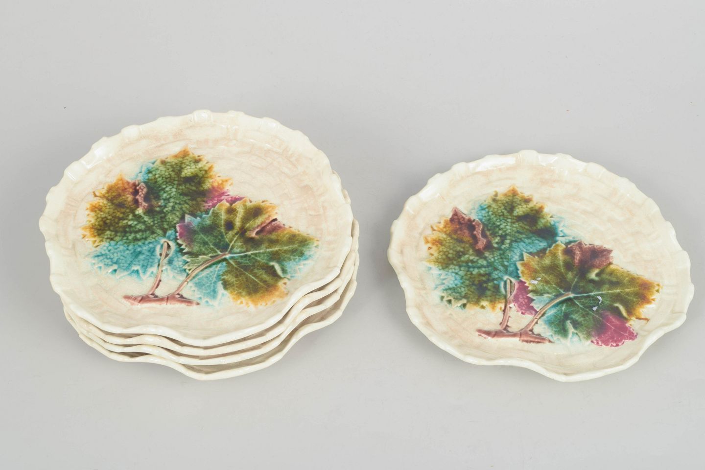 Decorative faience plates with relief and hand-painted decoration depicting foliage in multicoloured glazes.