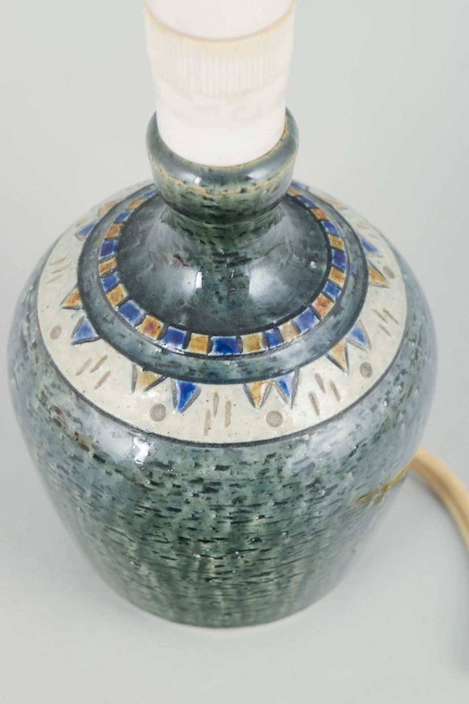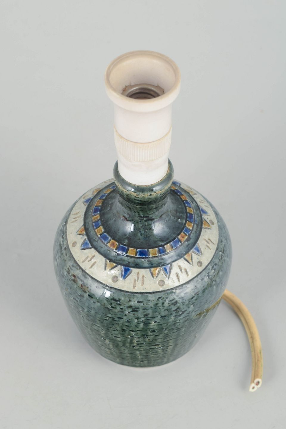 Decorative small table lamp in stoneware with characteristic textured surface and green glaze, fitted with socket. Short cord without plug.