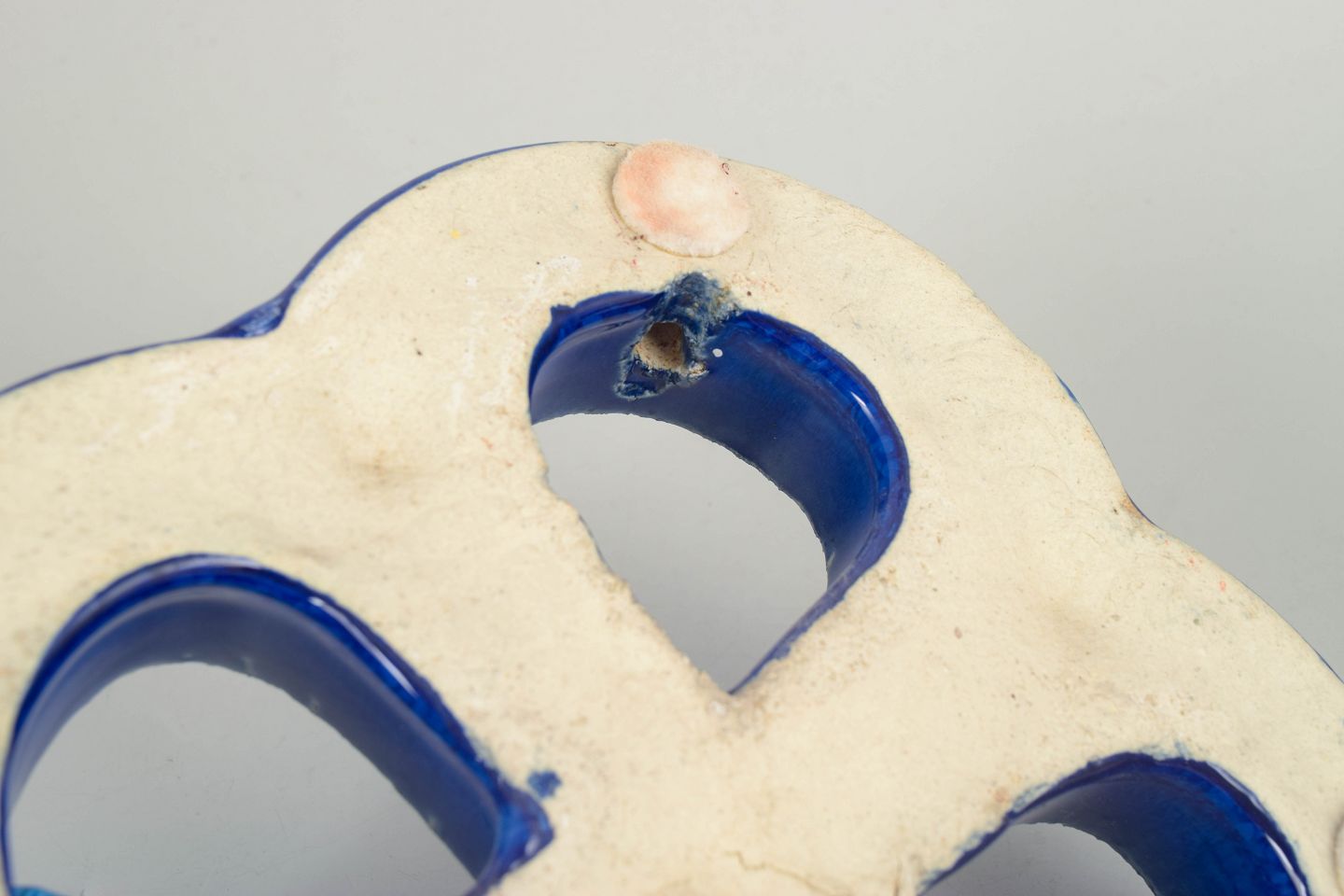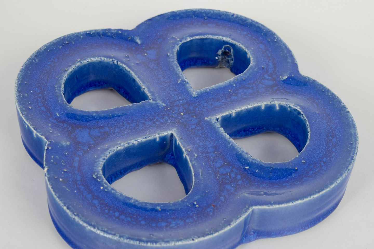 Decorative stoneware wall relief in an organic four-lobed form with open sections. Finished in a deep blue glaze with lively bubbling effects and surface variation. Reverse with hole for wall mounting.