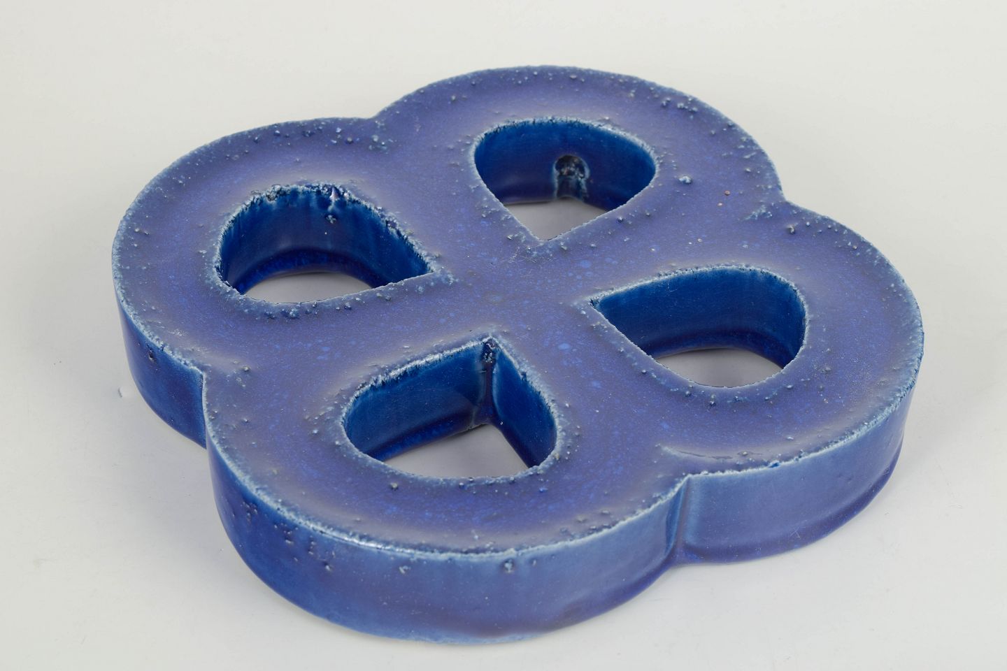 Decorative stoneware wall relief in an organic four-lobed form with open sections. Finished in a deep blue glaze with lively bubbling effects and surface variation. Reverse with hole for wall mounting.