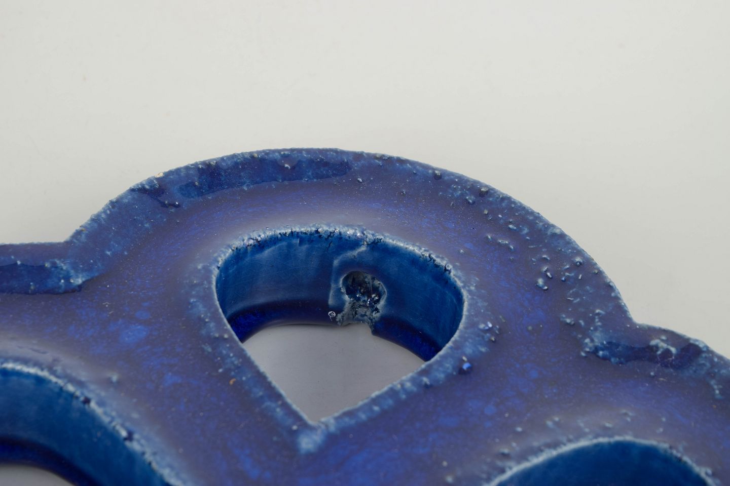 Decorative stoneware wall relief in an organic four-lobed form with open sections. Finished in a deep blue glaze with lively bubbling effects and surface variation. Reverse with hole for wall mounting.