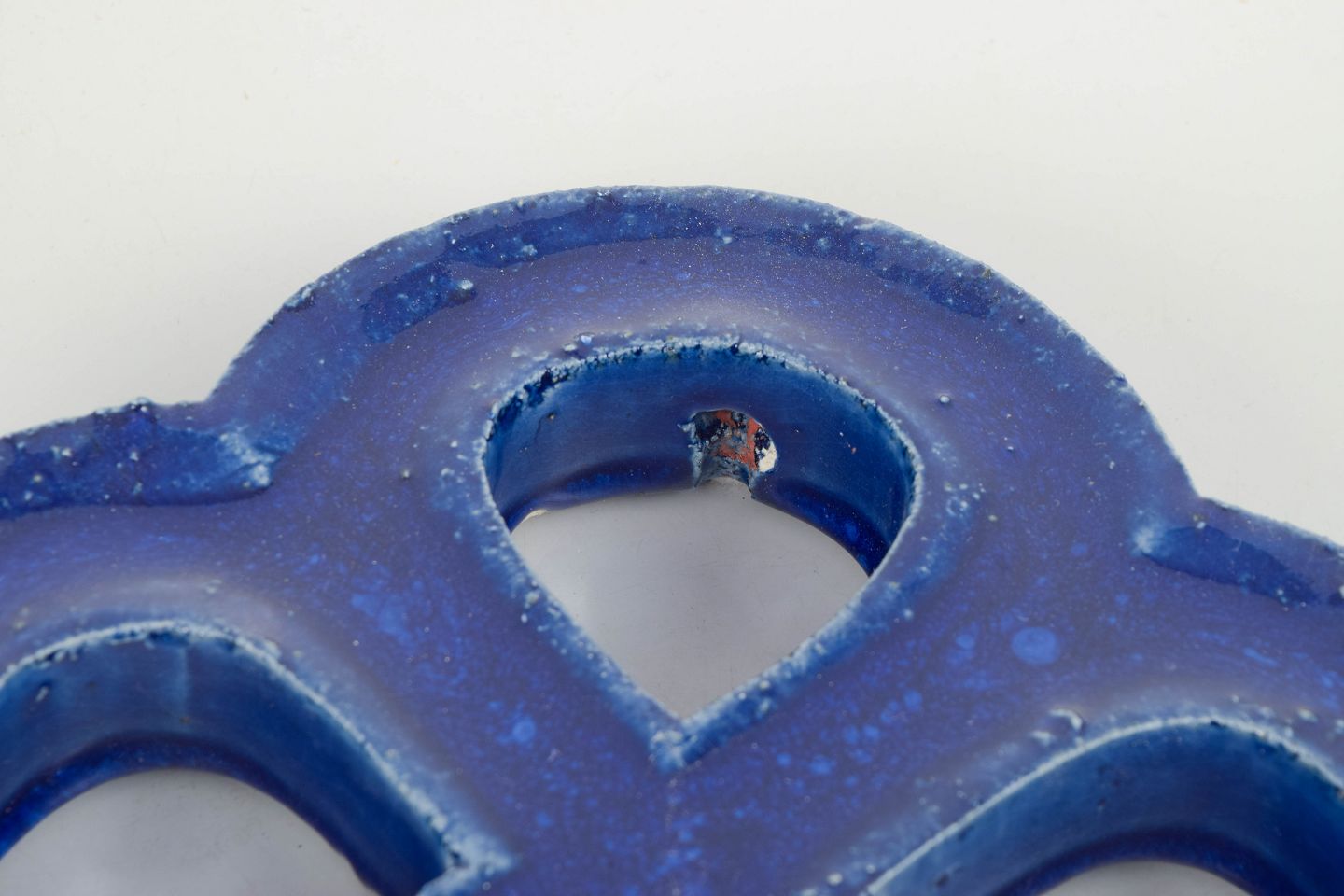 Decorative stoneware wall relief in an organic four-lobed form with open sections. Finished in a deep blue glaze with lively bubbling effects and surface variation. Reverse with hole for wall mounting.