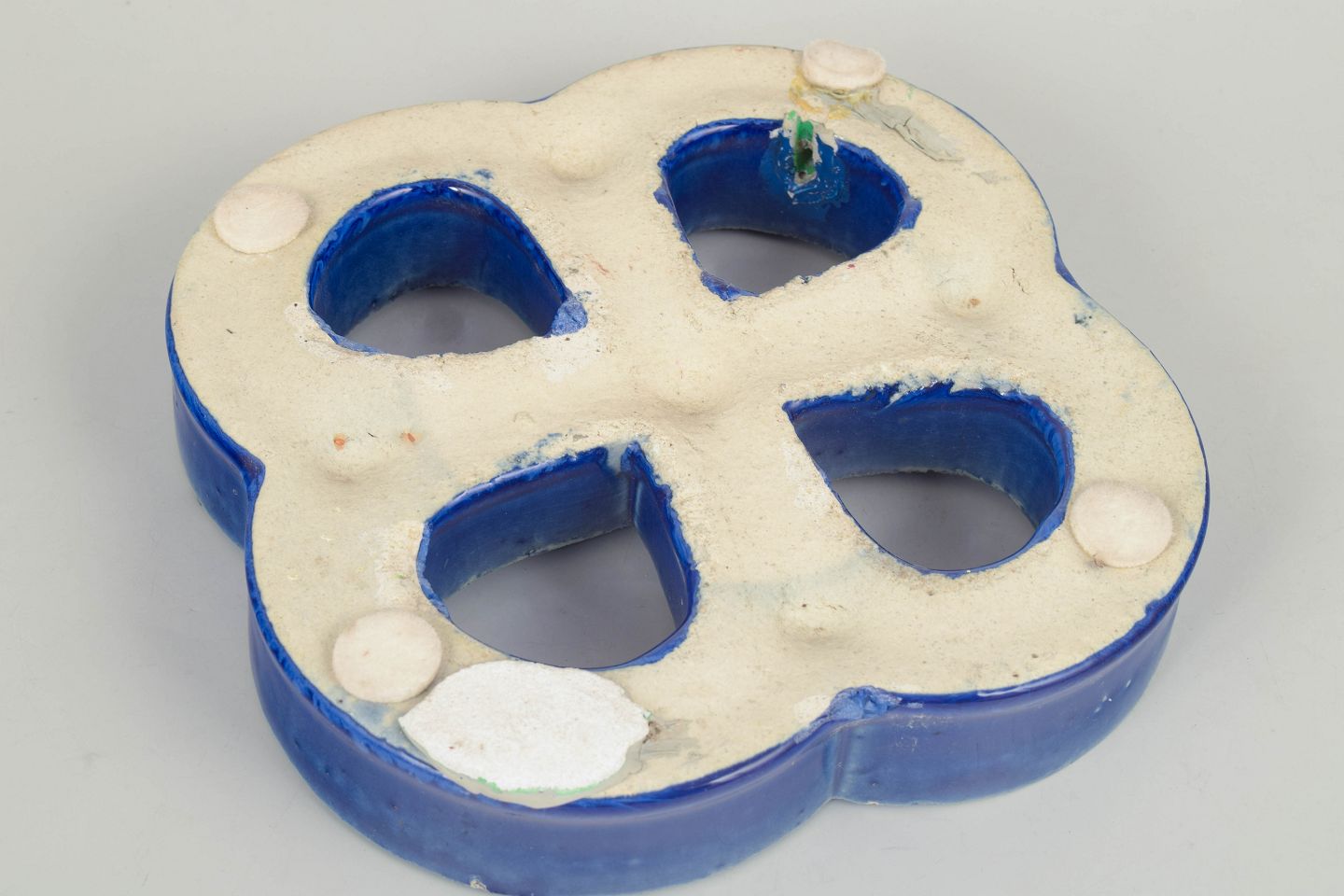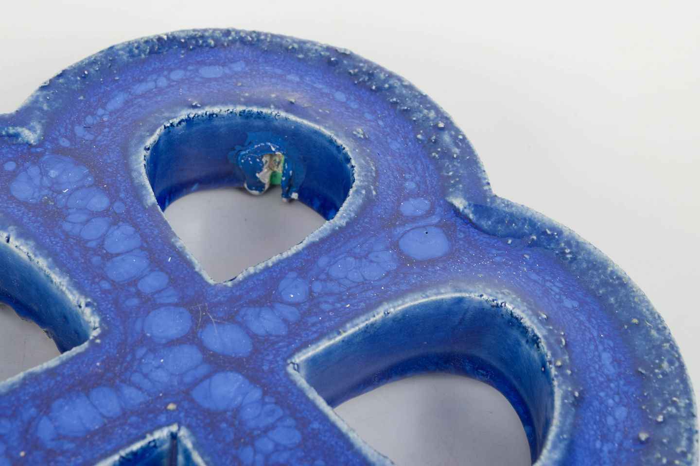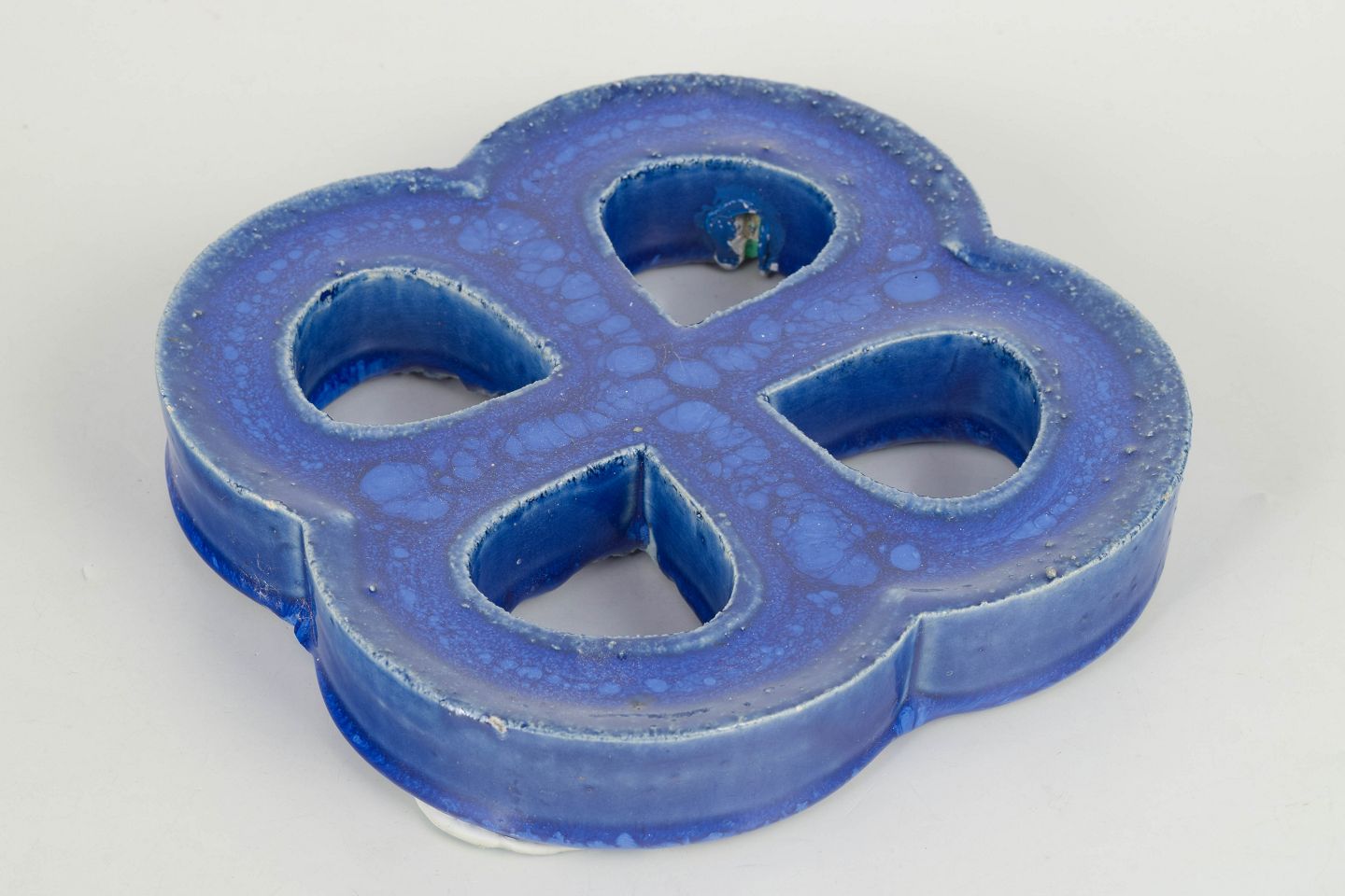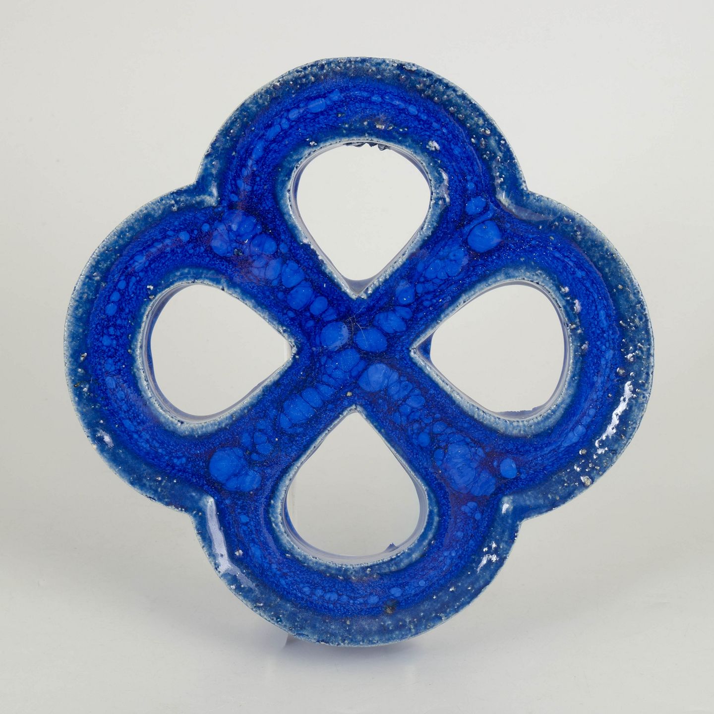 Decorative stoneware wall relief in an organic four-lobed form with open sections. Finished in a deep blue glaze with lively bubbling effects and surface variation. Reverse with hole for wall mounting.