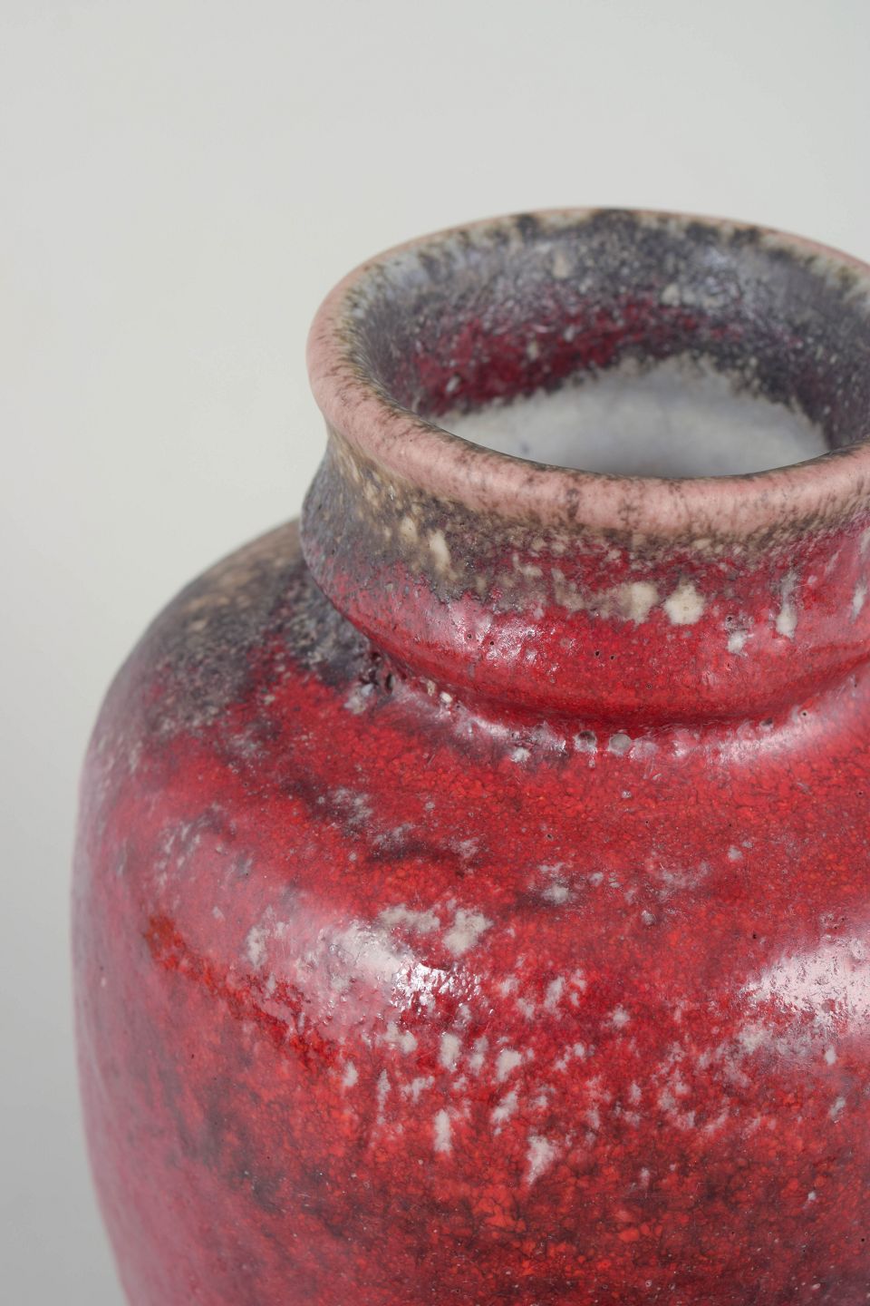 Ceramic vase with characteristic lava glaze in deep red and dark tones, featuring a heavily textured and organic surface. Model 7321.