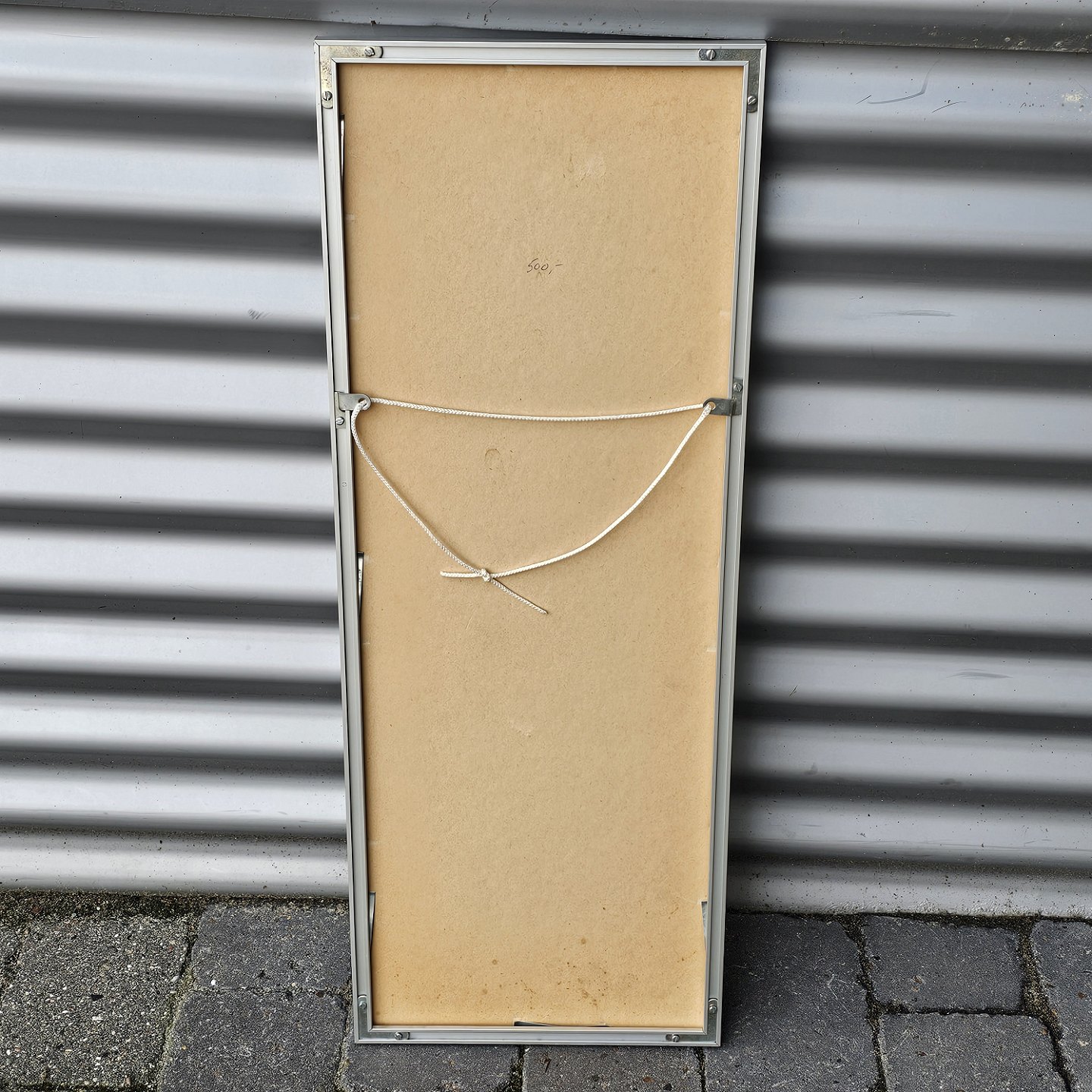 Litografi med blå, hvide og gule farver på lyseblå baggrund i metal ramme. 13/92