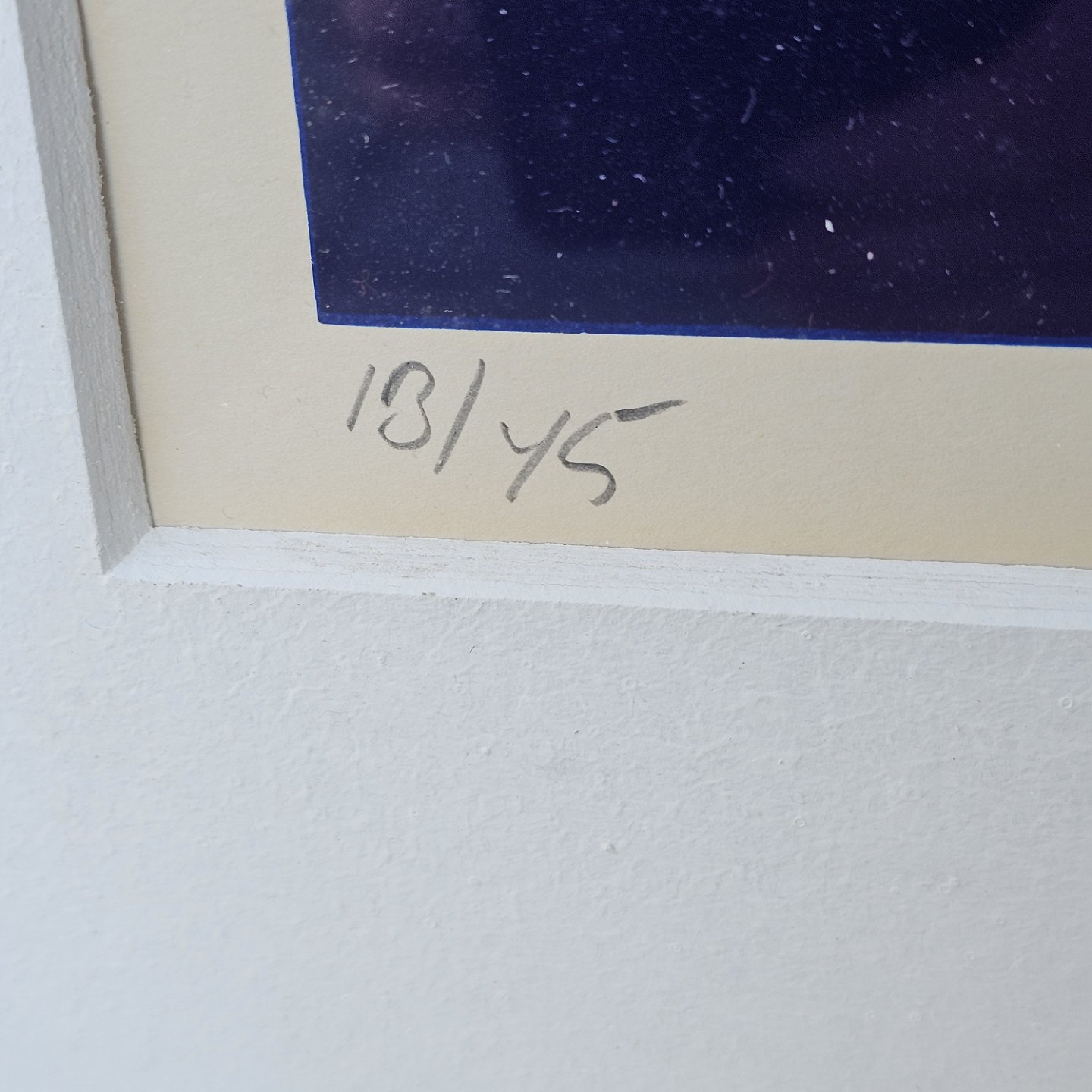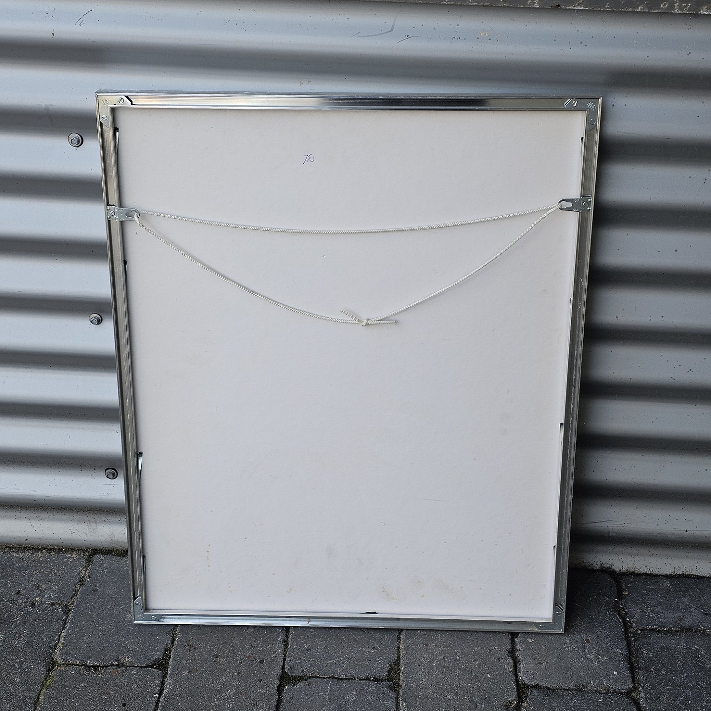 Litografi i rød og mørkeblå med baggrund af brosten i metal ramme. 13/45