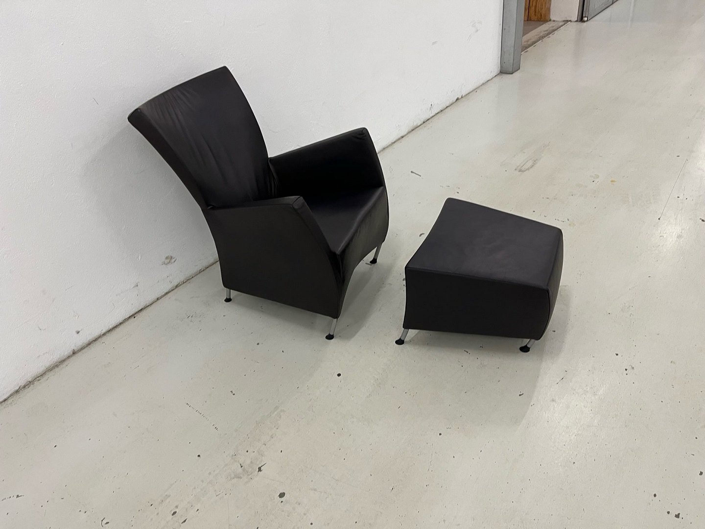 Designer: Gijs PapavoineWindy chair w/stool in black Panama leather and with chromed steel legs. The chair has been renovated and is in like new condition, and has been used sparingly, comes from a pet/smoke/child free home. Original new price. 24,490,-
