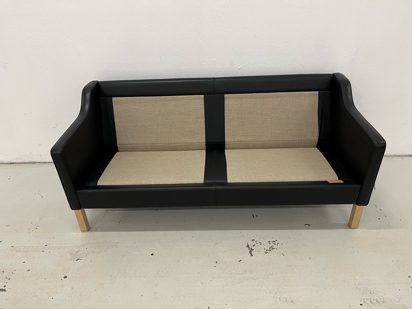 Exclusive Mogens Hansen MH 195 - 2.5-seater sofaThis exclusive 2.5-seater sofa from designer Mogens Hansen, model MH 195, is presented in black Odin 18 leather (group 2) with elegant legs in soap-treated oak. The sofa's original new price was DKK 37,511. PS. The sofa has removable legs if you want a different type of wood or metal legs. The sofa is extremely well maintained and has only been used minimally. It comes from a smoke-free and pet-free home without children. It has recently been professionally cleaned and leather-treated, and therefore appears in particularly beautiful condition - close to new and without faults or defects. The design is classic and timeless, which makes the sofa suitable for a wide range of interiors. It is made with seat inserts that ensure optimal comfort and a harmonious expression. The combination of aesthetics and functionality makes the sofa an obvious choice for the quality-conscious buyer who wants both style and high seating comfort. Dimensions: Length: 179 cm Depth: 80 cm Height: 76 cm Seat depth: 51 cm Seat height: 42 cm