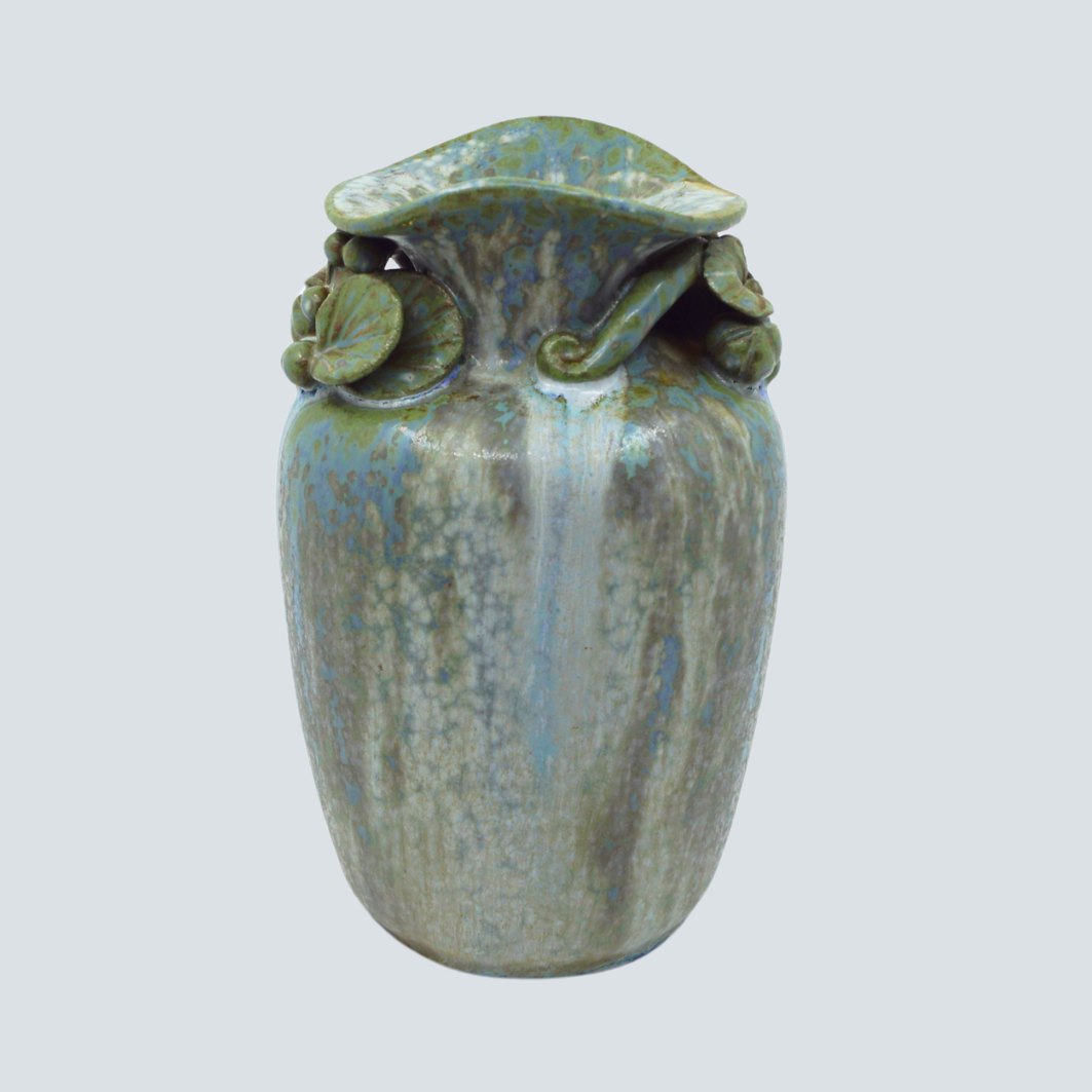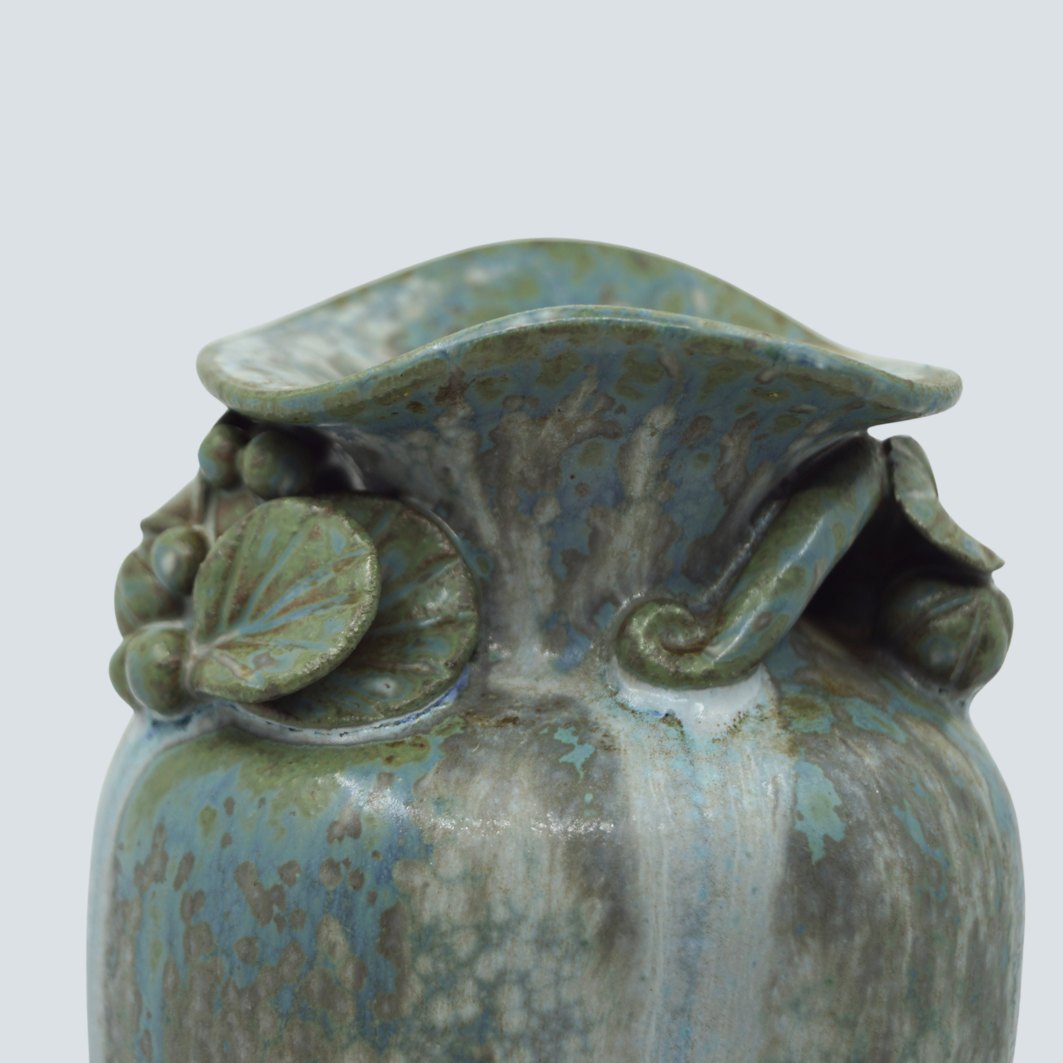 Arne Bang; Vase of stoneware, decorated with flowers. In blue-green glaze. In good condition. H. 14.8 cm. W. 9 cm.