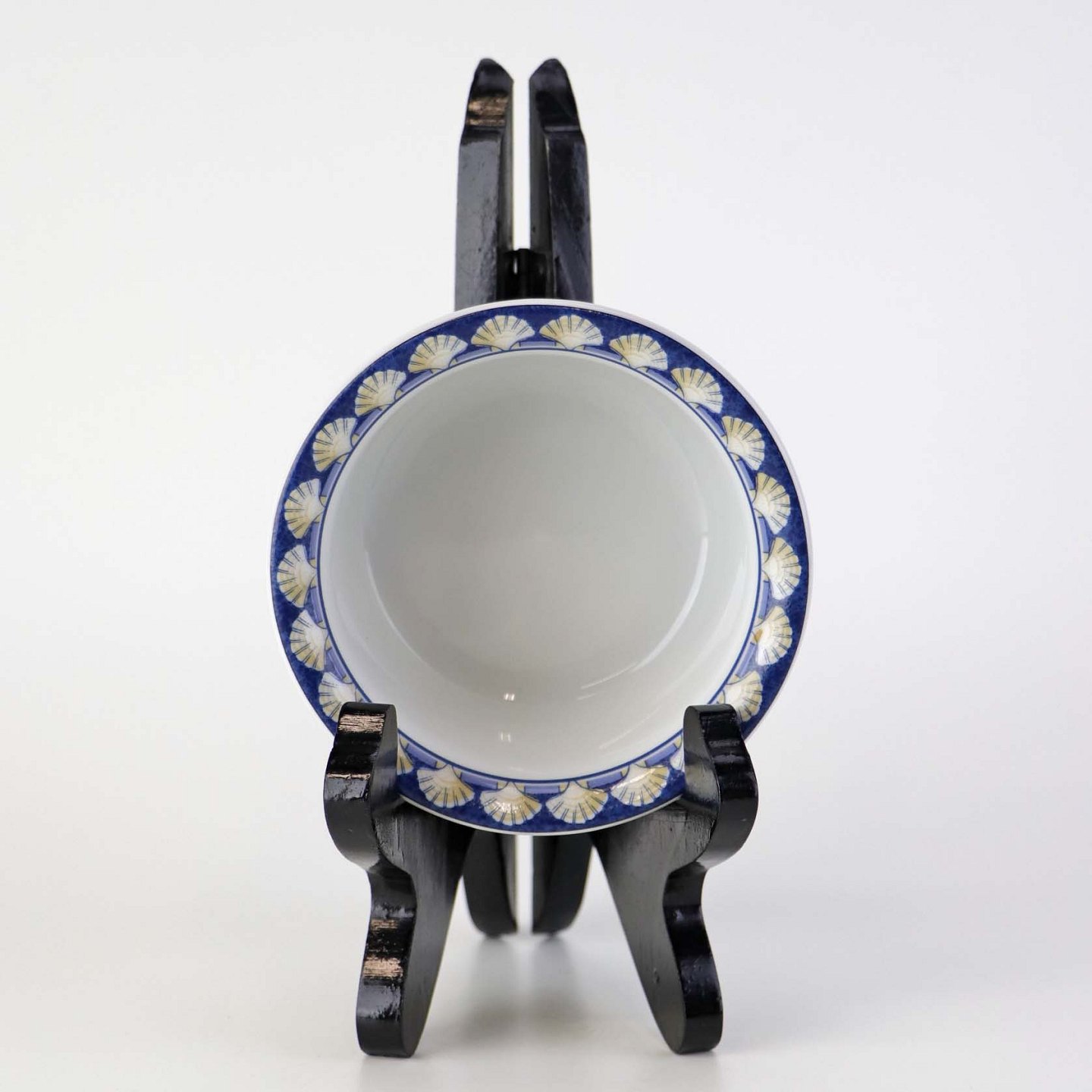 Service i glat hvid porcelæn med blåt bånd og dekoration af gule vifteformede strandskaller. Stellet kan gå i opvaskemaskinen.