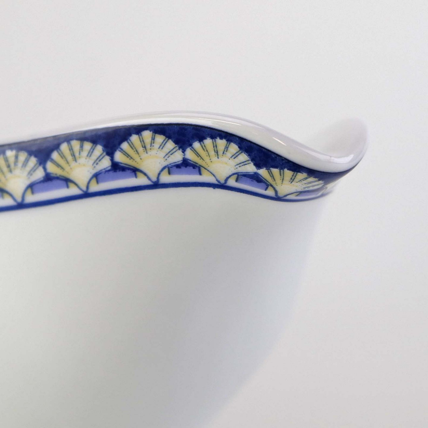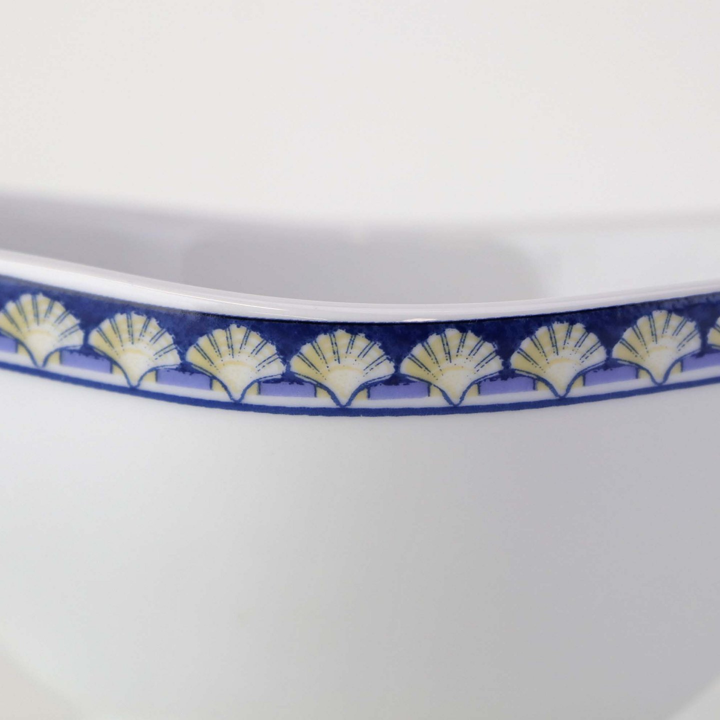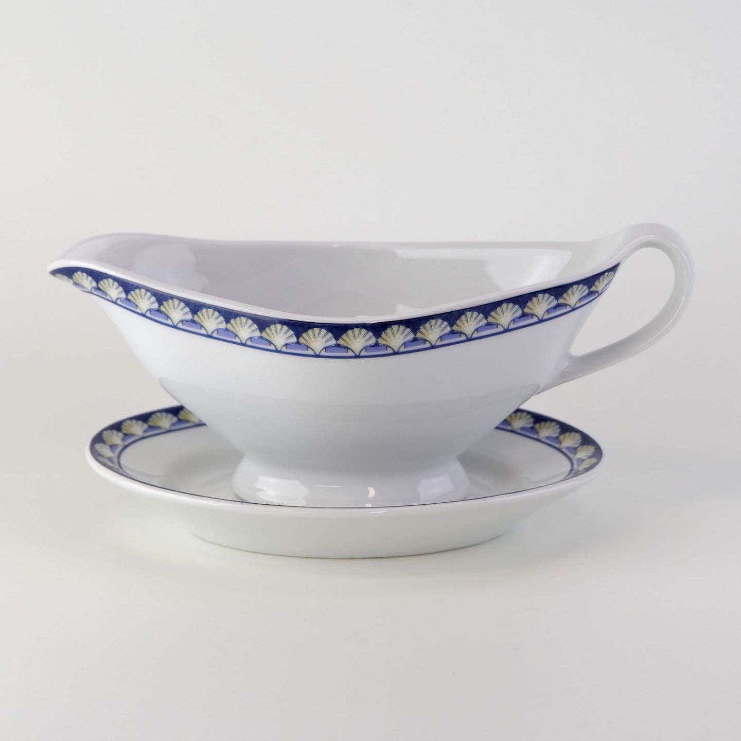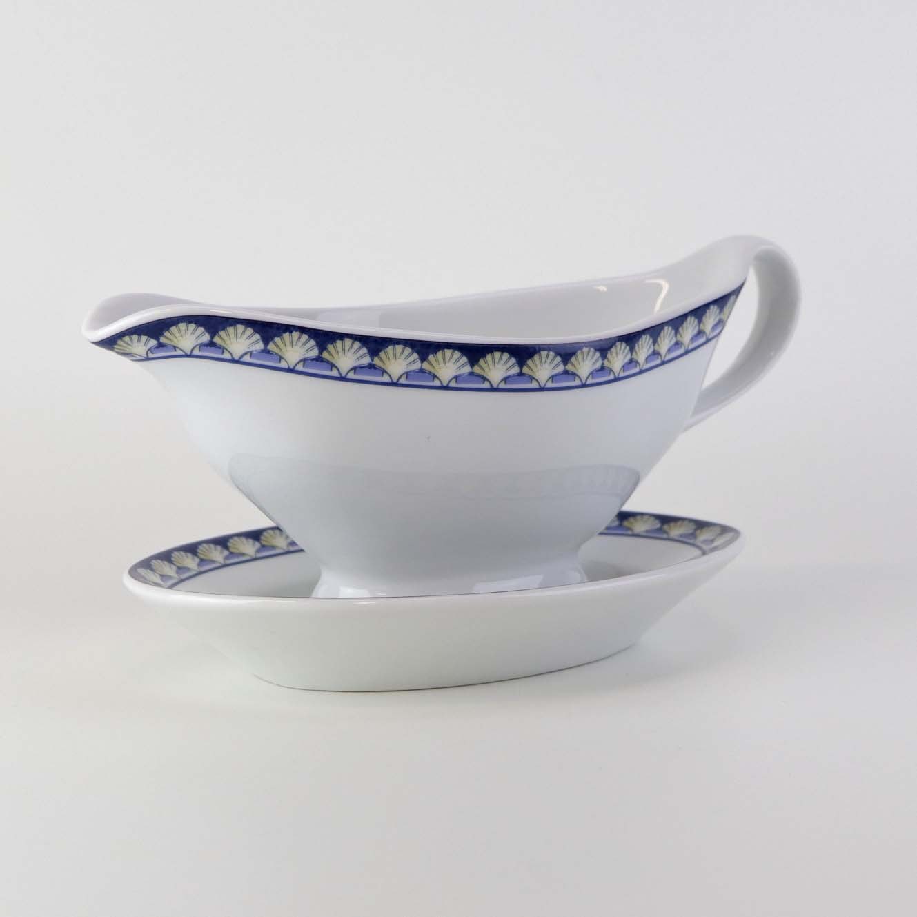 Service i glat hvid porcelæn med blåt bånd og dekoration af gule vifteformede strandskaller. Stellet kan gå i opvaskemaskinen.