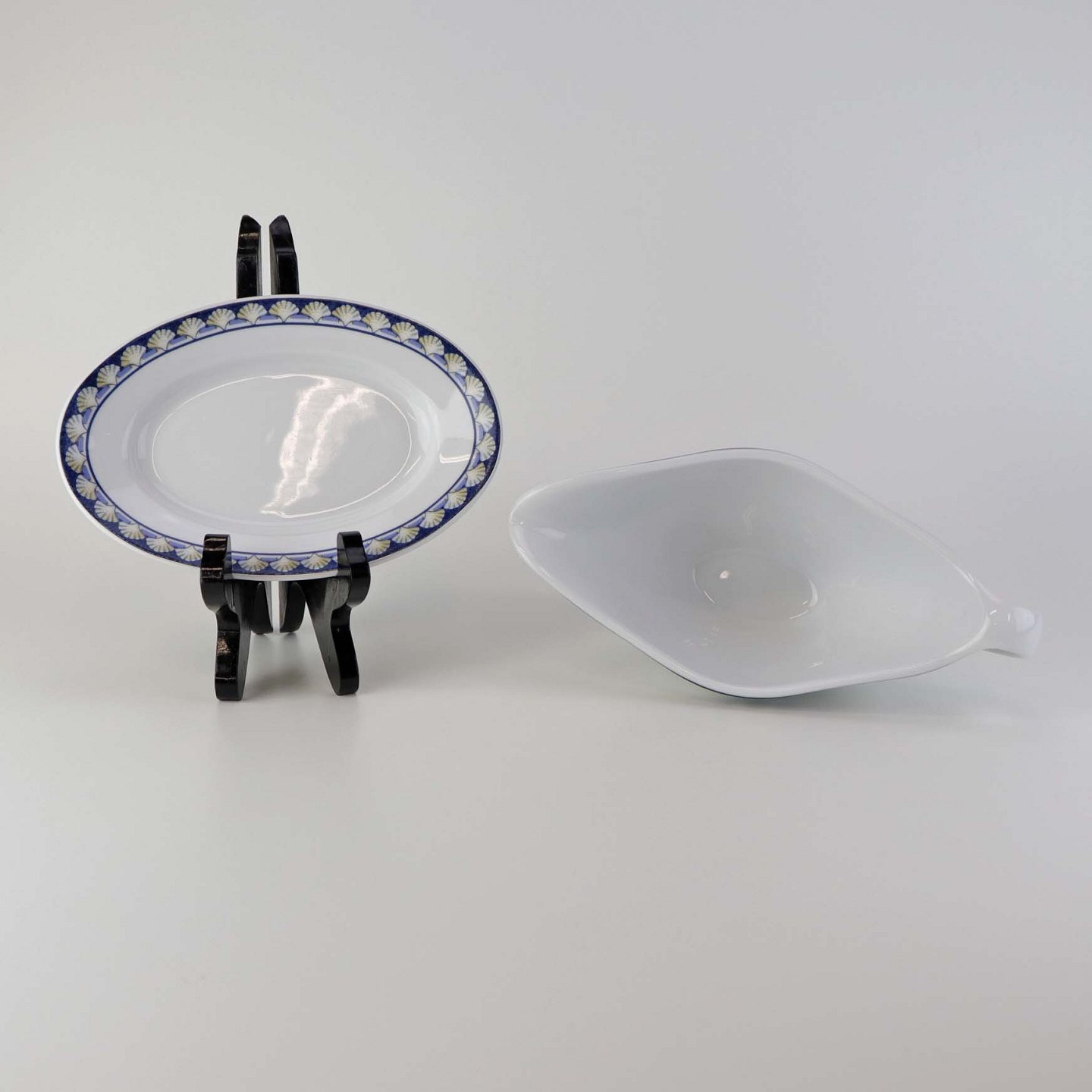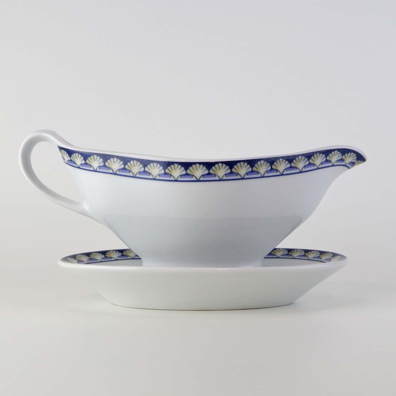 Saucekande med tilhørende underskål i porcelæn fra stellet Maeva. Nr. U11 og V4