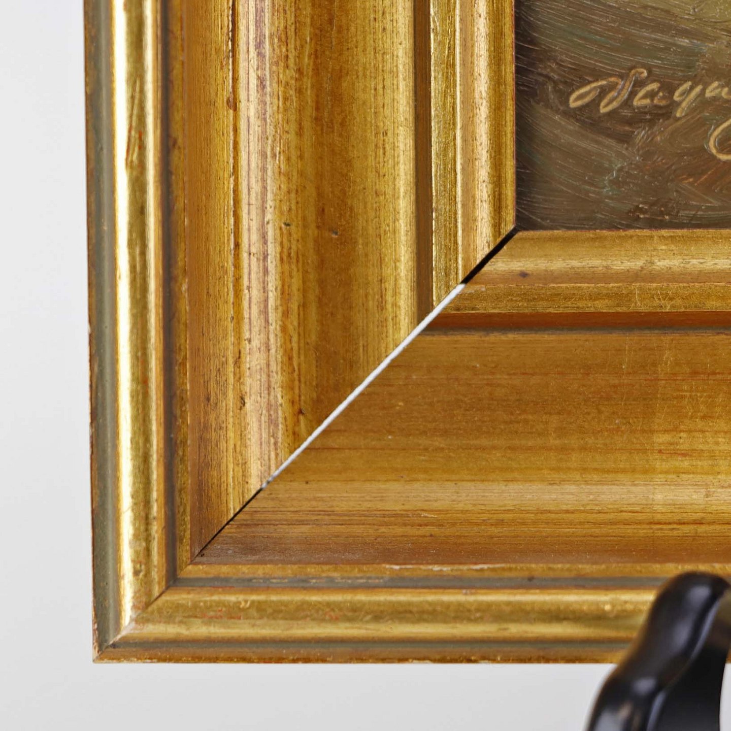 Maleri på plade i guldmalet træramme med med ældre interiør motiv fra dansk bondehus.