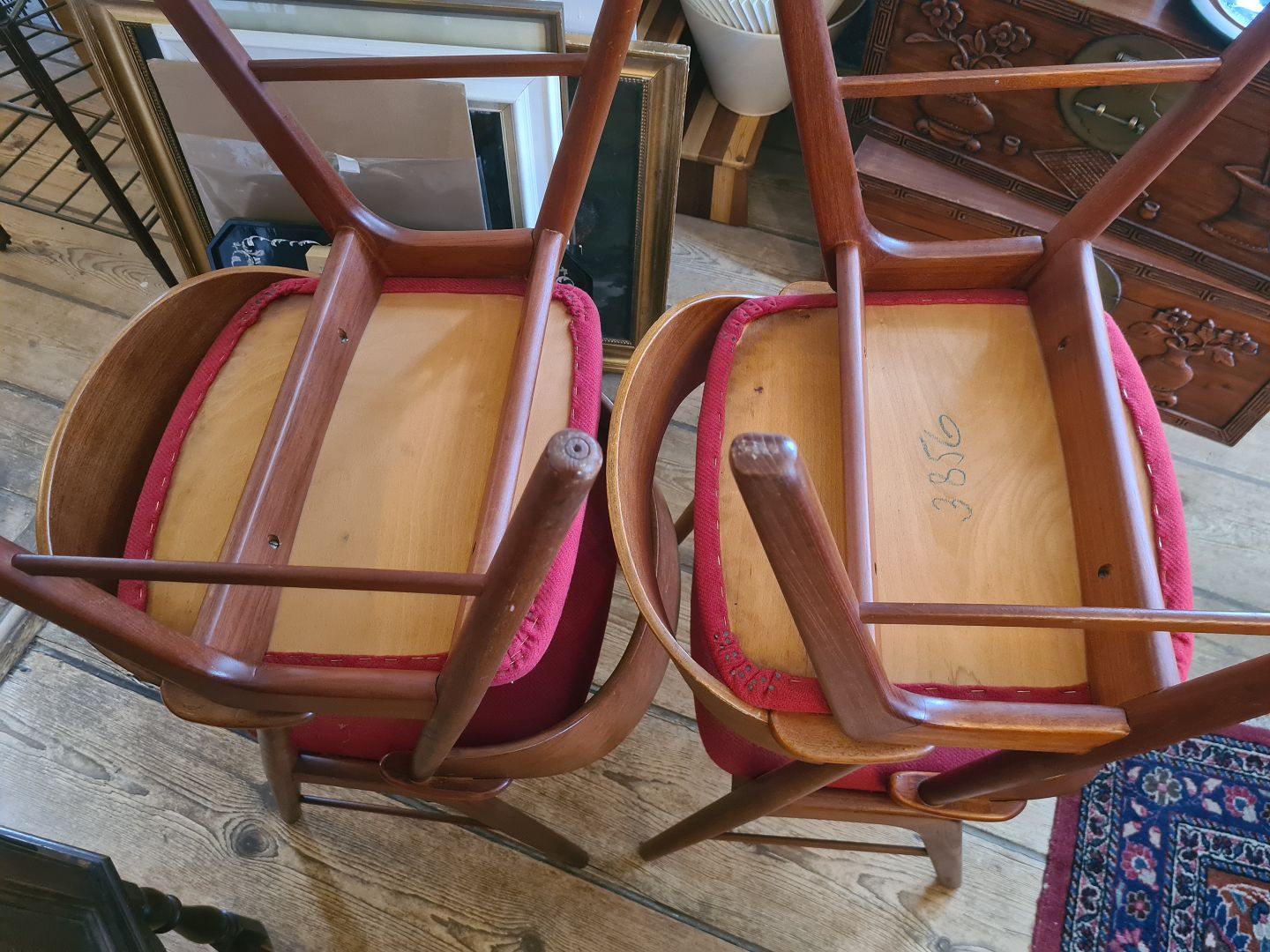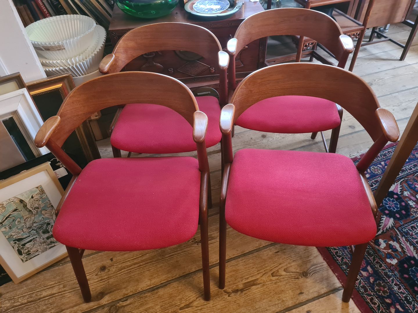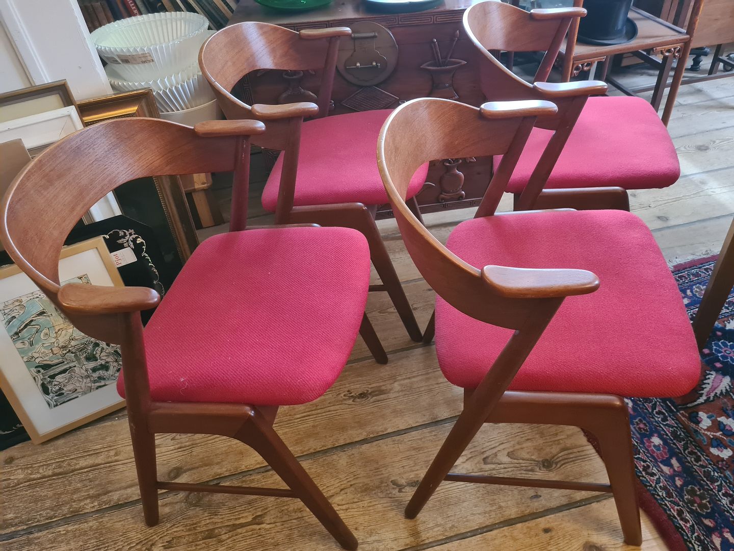 4 spisebordsstole fra 1960'erne designet af Kai Kristiansen. Her i teak med stofbetrukket sæde. Fremstår pæne og velholdte uden nævneværdige brugsspor.