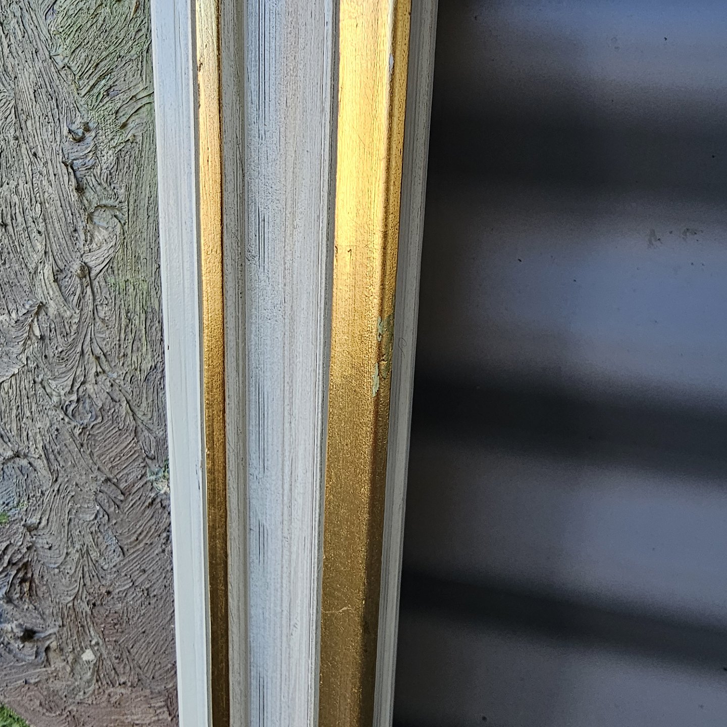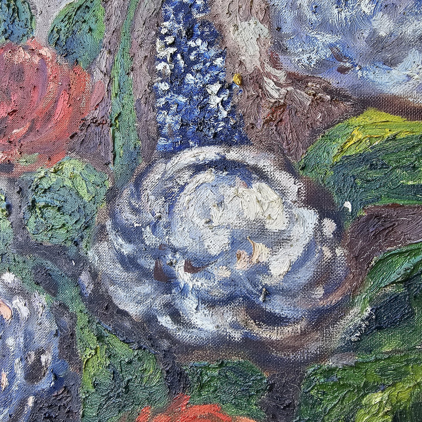 Oliemaleri på lærred monteret i hvid- og guldmalet ramme med motiv af en vase med blomster