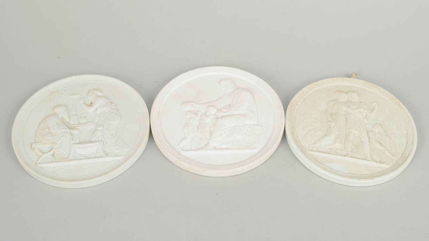 Royal Copenhagen, set of three biscuit wall plaques after Thorvaldsen.