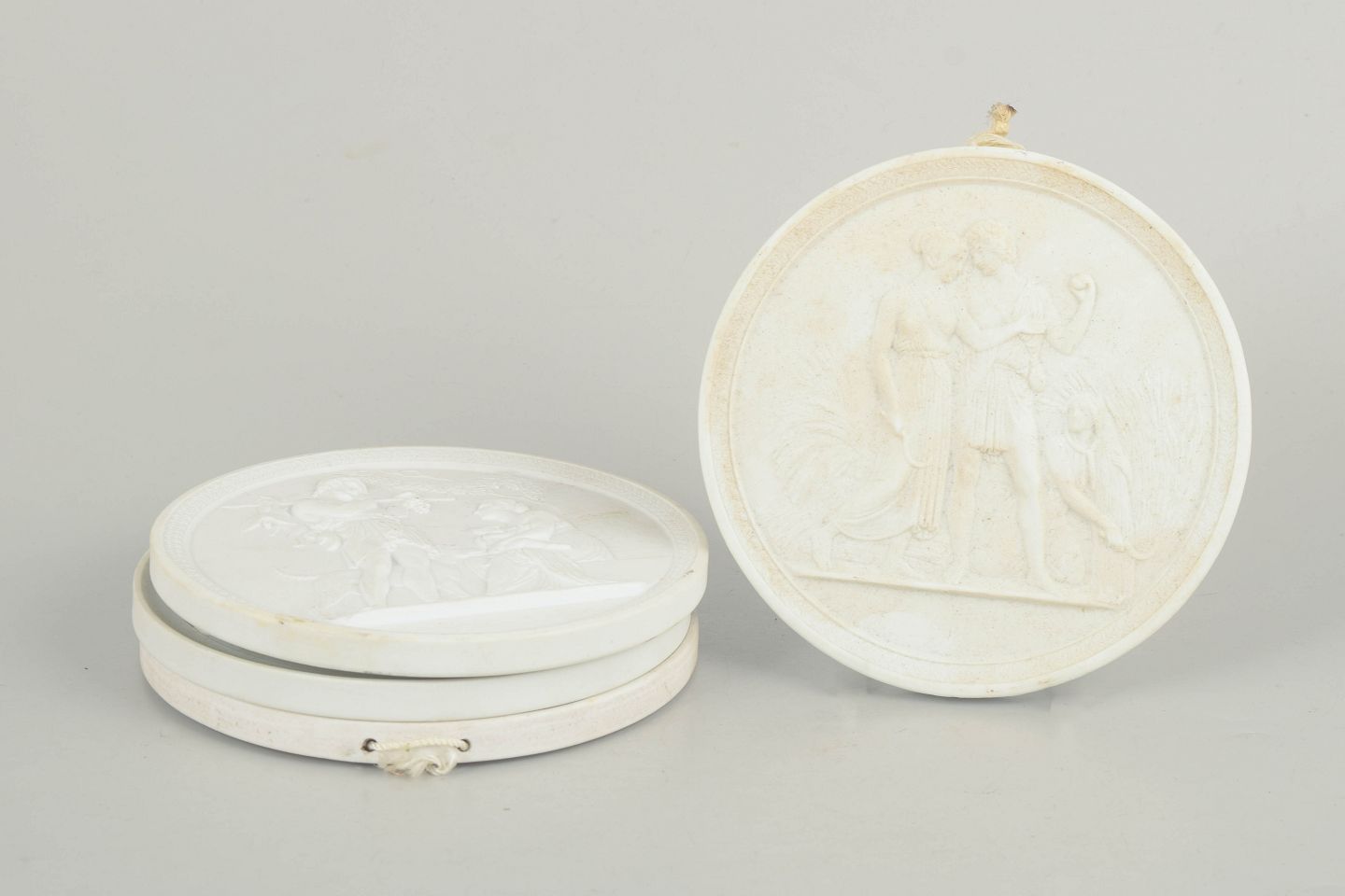 White unglazed porcelain reliefs with classical motifs after Bertel Thorvaldsen, executed in fine biscuit with detailed figural decoration and suspension mounts on the reverse. First and third factory quality.