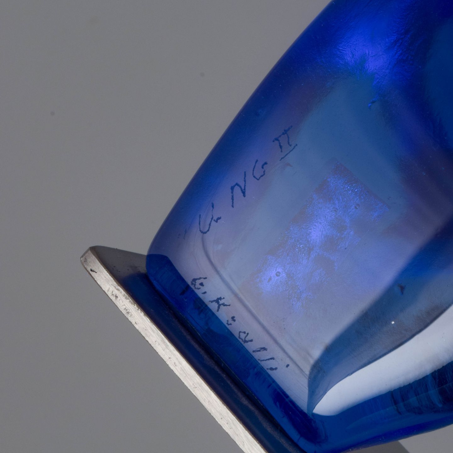 Organically shaped sculpture in mouth-blown glass with a deep blue tone and encapsulated figurative elements. Signed by the artist and produced in her own studio.