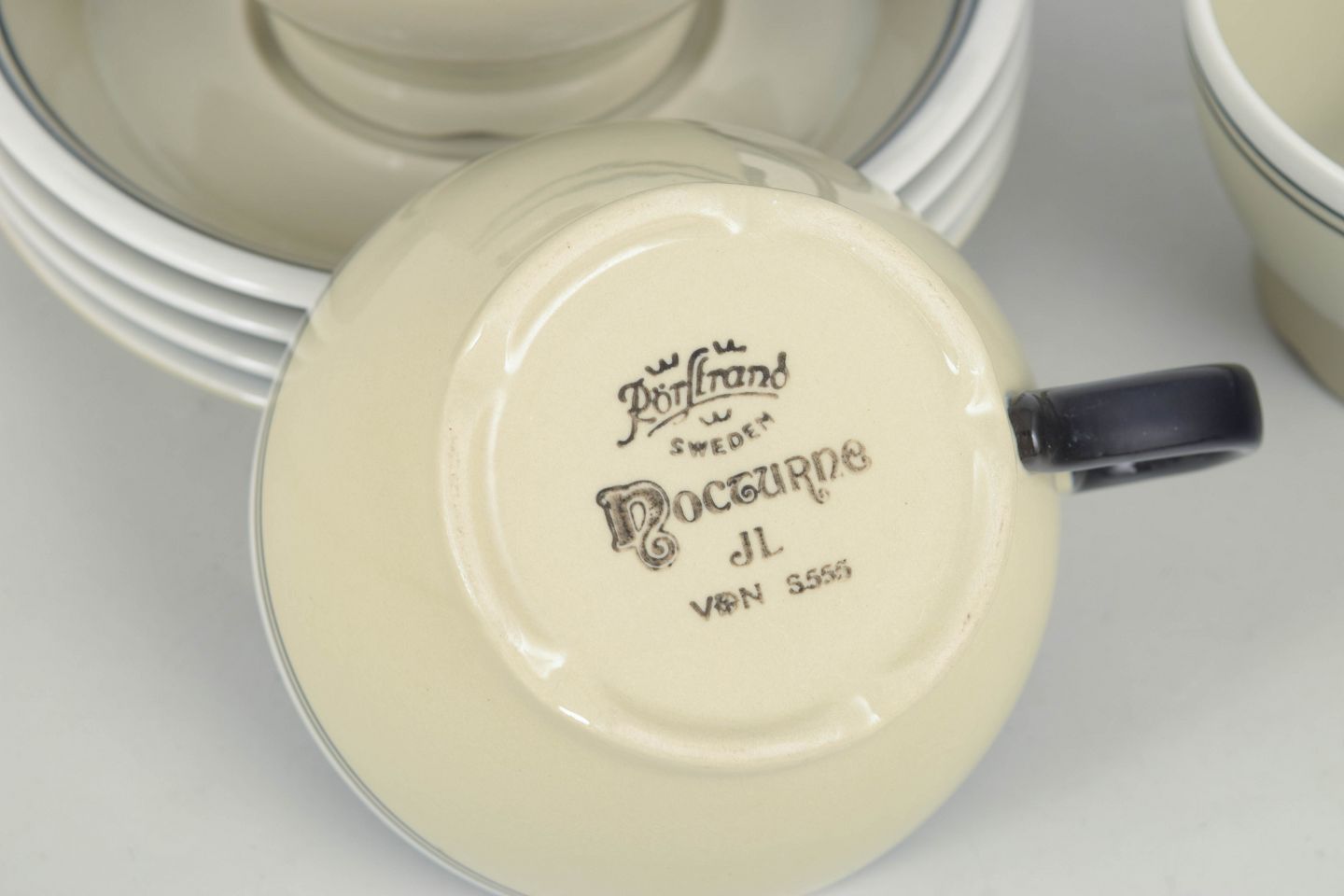 Elegant faience teacups with matching saucers, executed in a clean and refined form with a light glaze. The “Nocturne” series reflects the functional and timeless design tradition of Rörstrand in the 1960s.