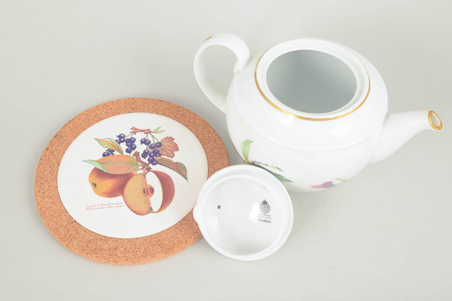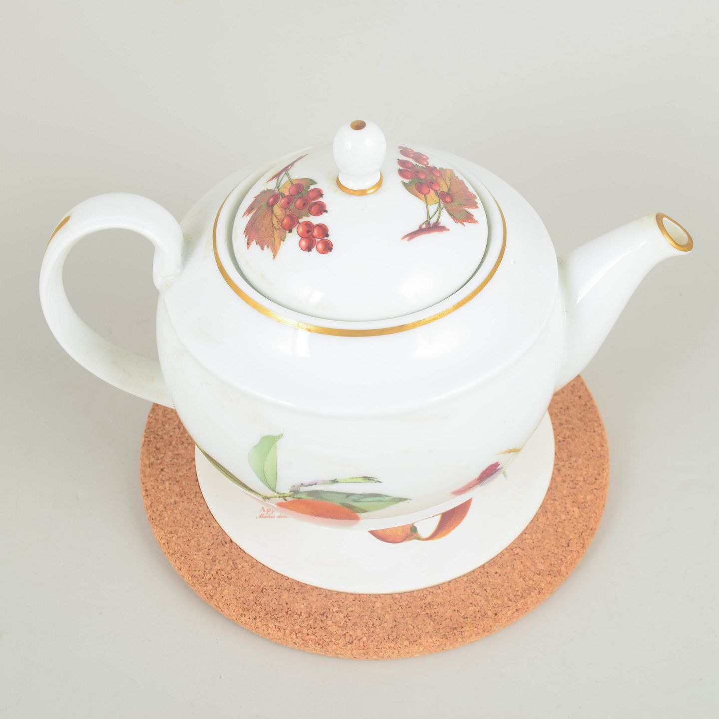 Porcelain teapot with classic fruit decoration in warm tones and a gilt rim, with matching stand. Evesham model.