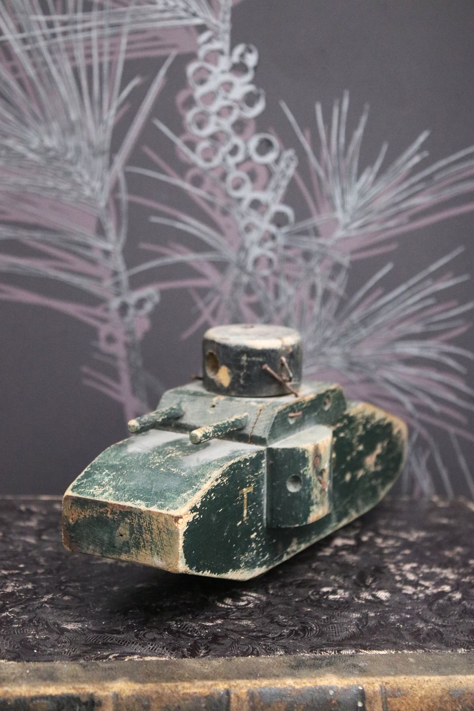 Decorative, old vintage tank in green painted wood with a nice old patina. H: 9.5cm. L: 20cm.
