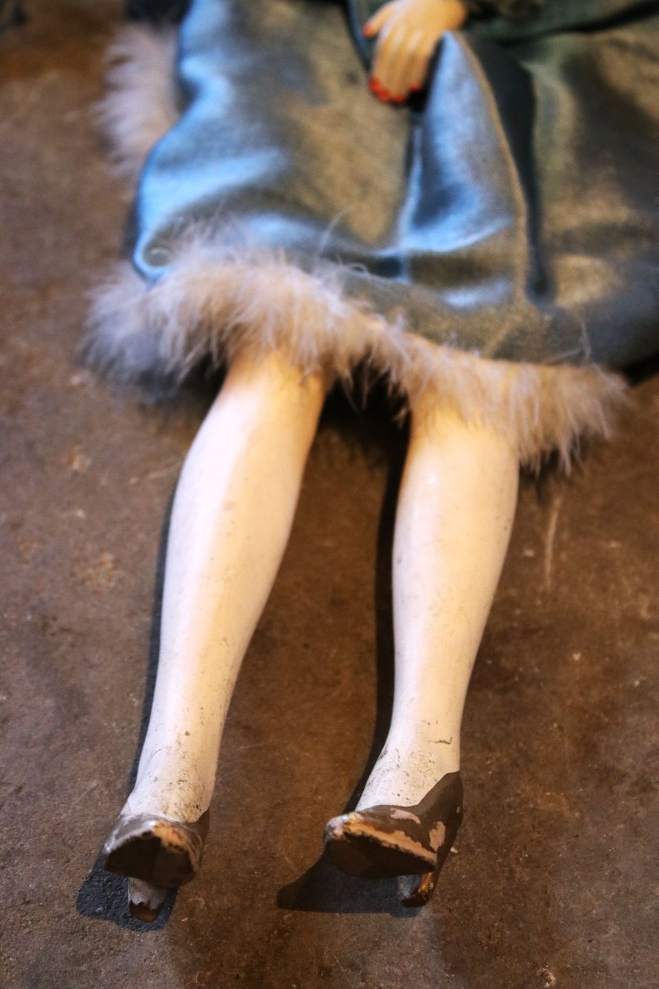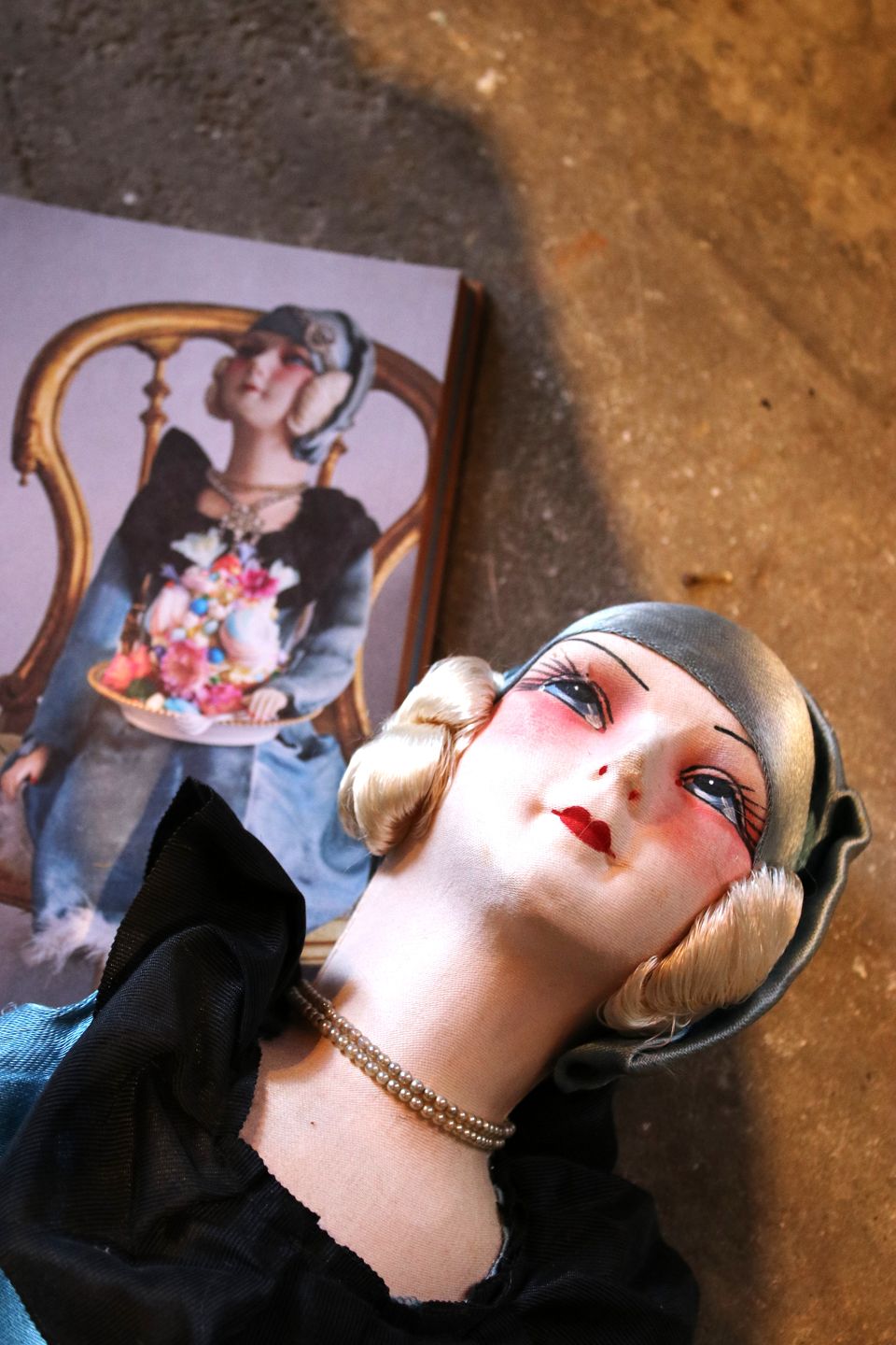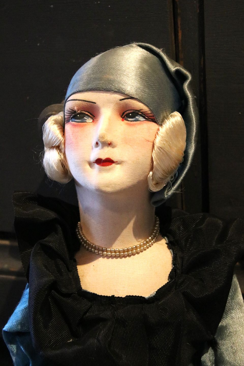 Old French vintage boudoir doll in fabric with silk dress. Height: 72cm. (The doll has been pictured in Shane Brox's children's book "Build a Better World")