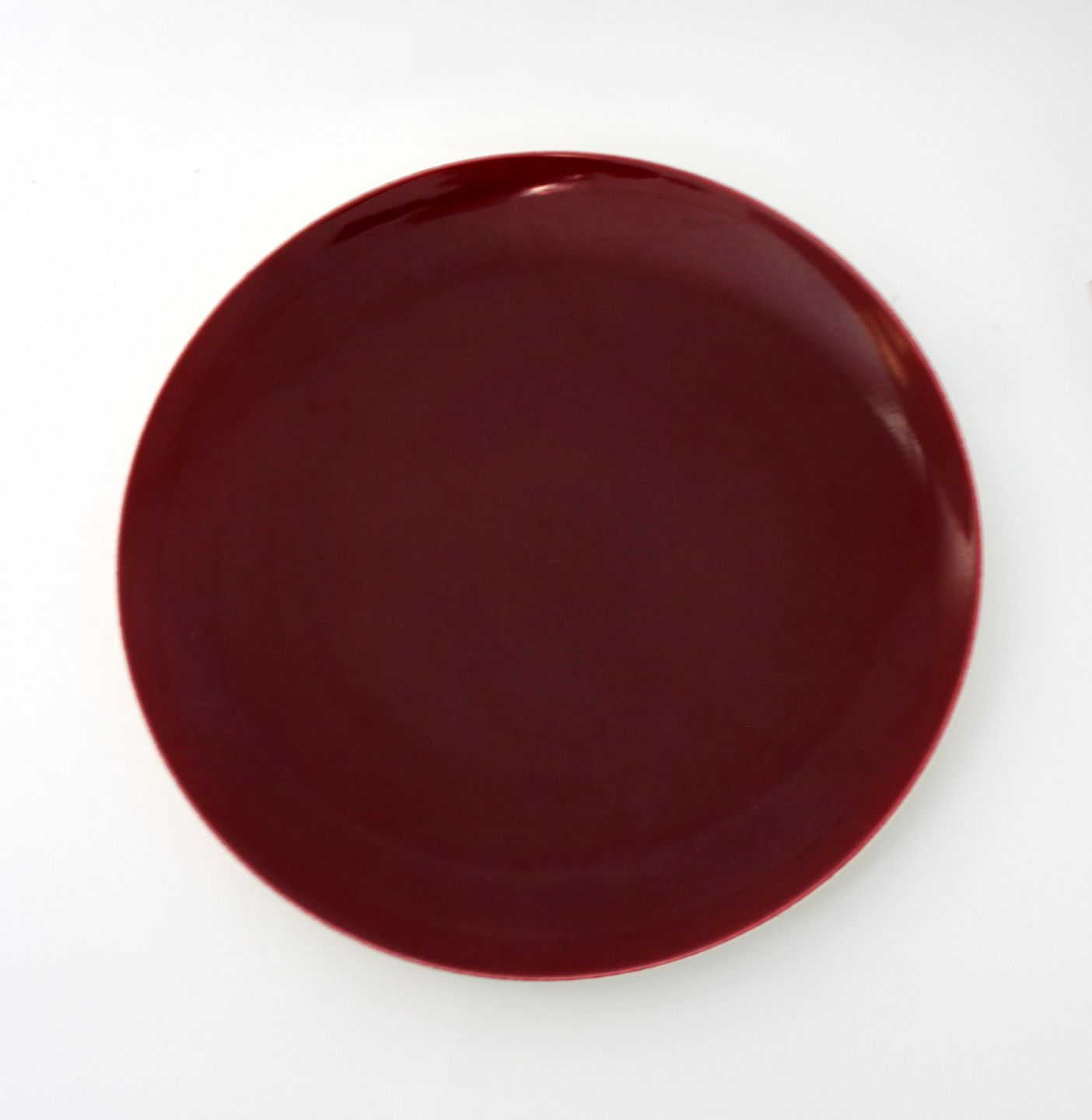 Text available in Danish: Aluminia, Confetti smukke bordeaux glasserede middagstallerkener. Efterhånden sjældne i flot stand og den store størrelse, disse har lettere almindelig brugsslid i form af småridser i overfladen. Nr. 5. Diameter 25,5 cm. Pris: 350 kr. stk. Lager: 4