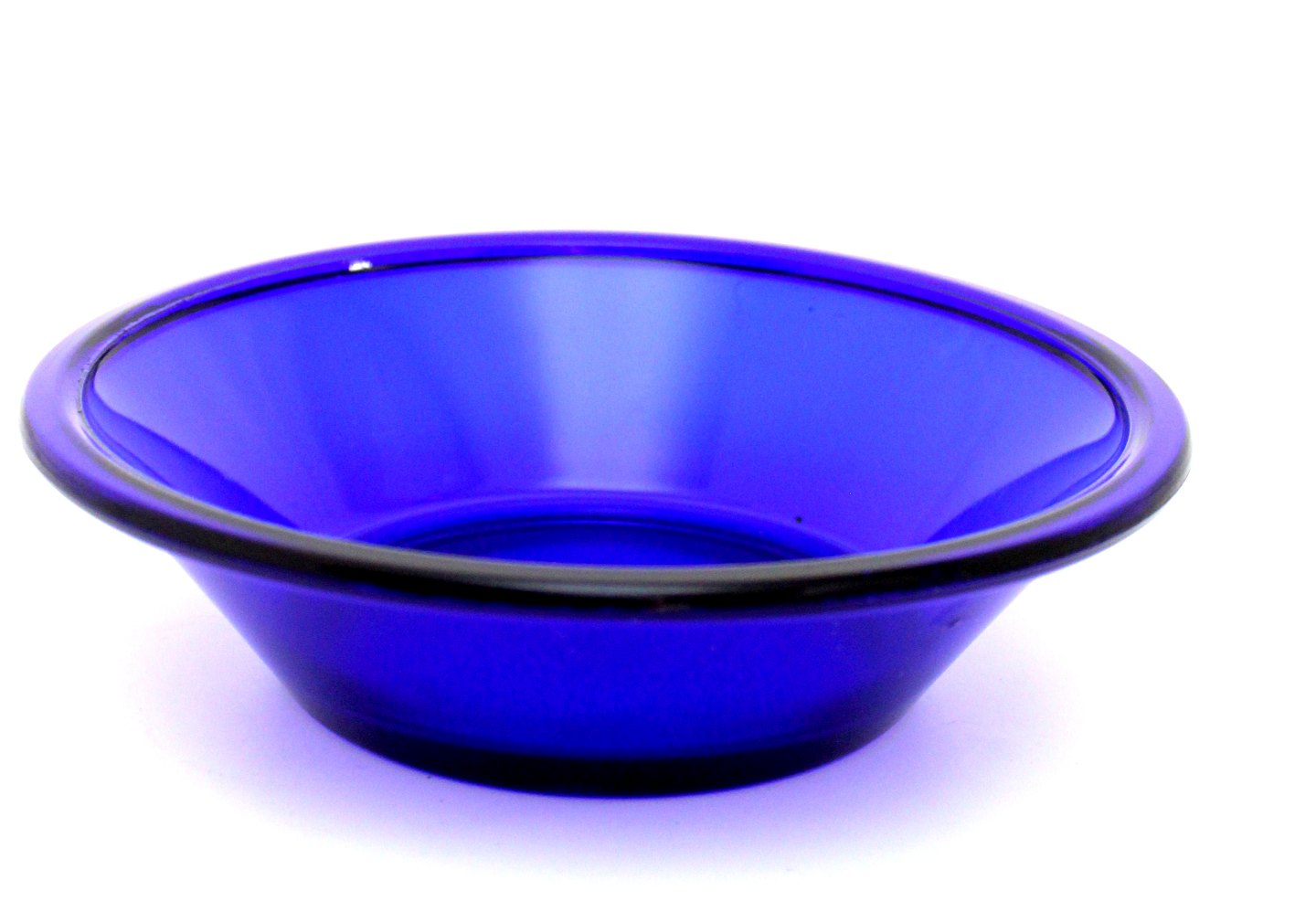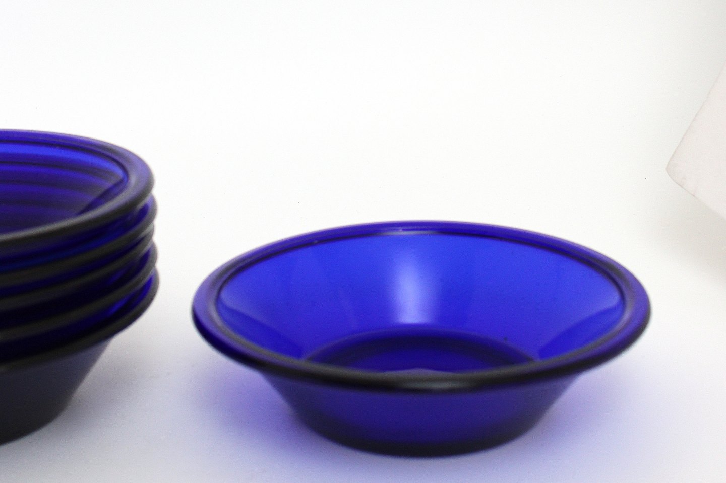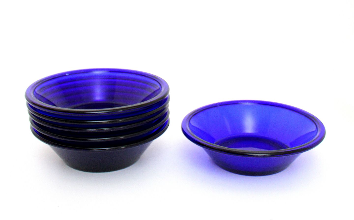 Text available in Danish: Holmegaard, Else, Tykmælksskål i presset kobolt blå glas. Designet i 1938 og produceret frem til slut 1970'erne i varierende størrelser, men samme form og blev kaldt ymerskål
