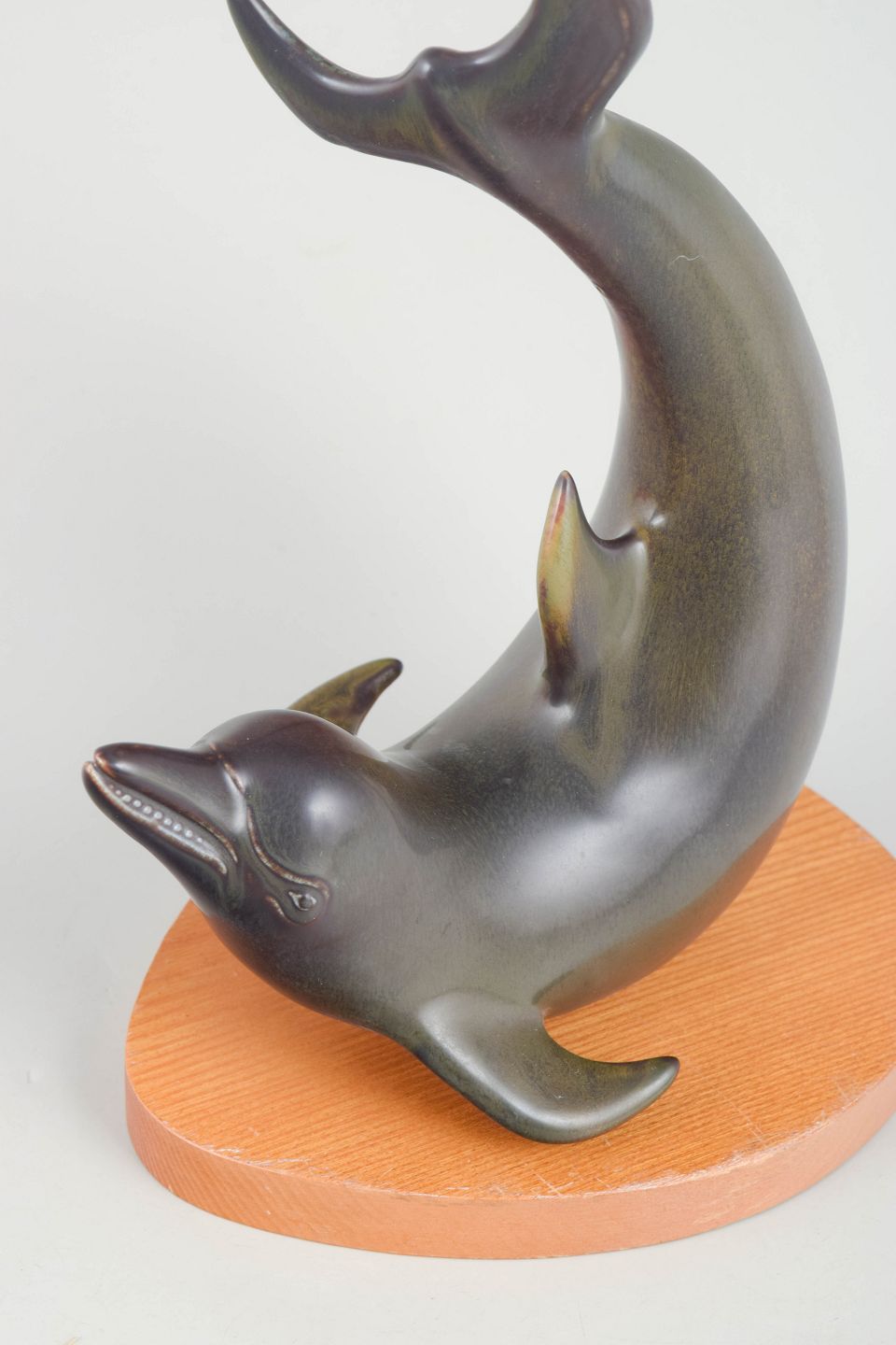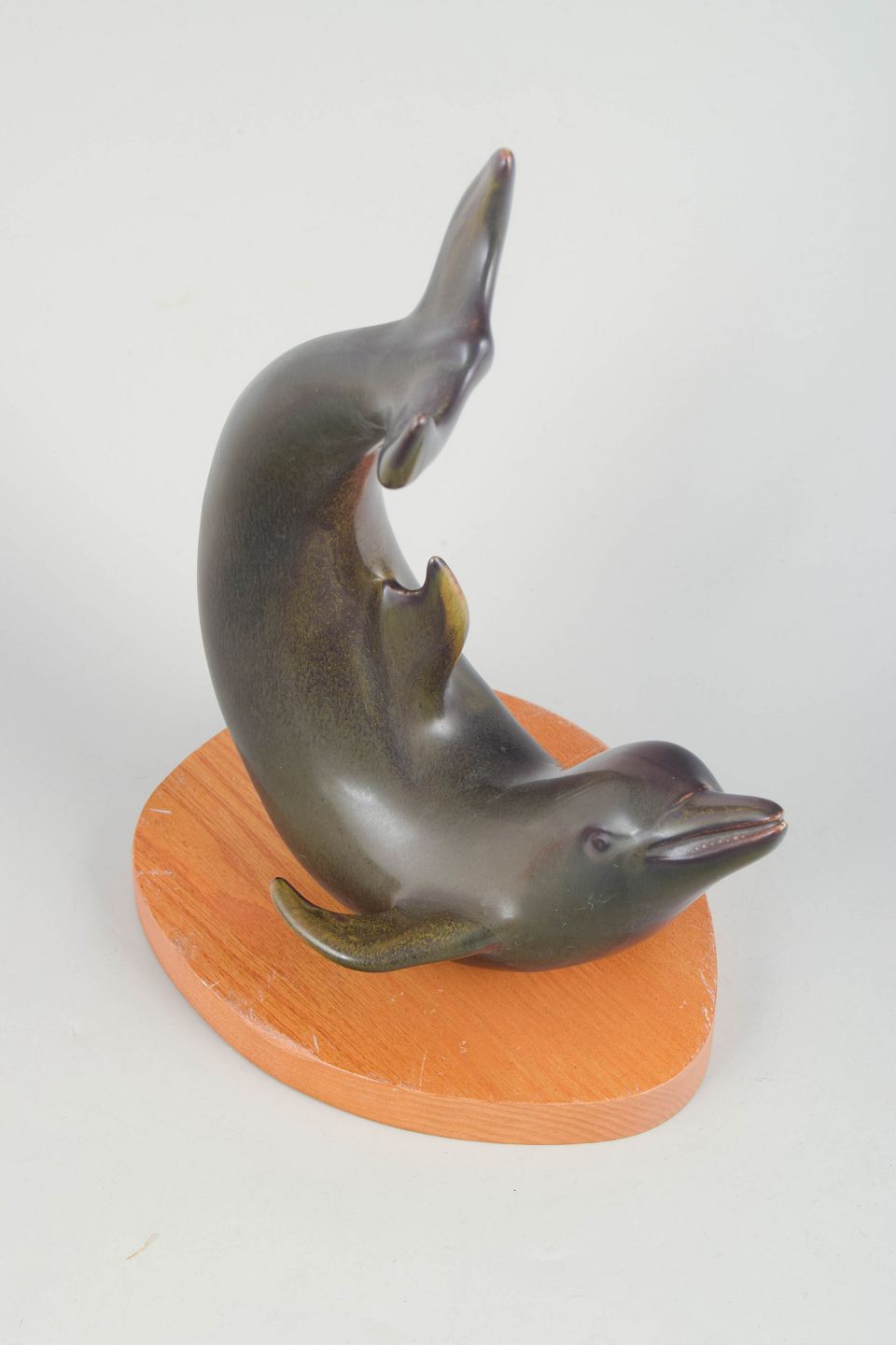 Stylised dolphin executed in stoneware with a soft organic form and muted glaze in green and brown tones. The figure is mounted on its original wooden base. Model referenced in the decoration.