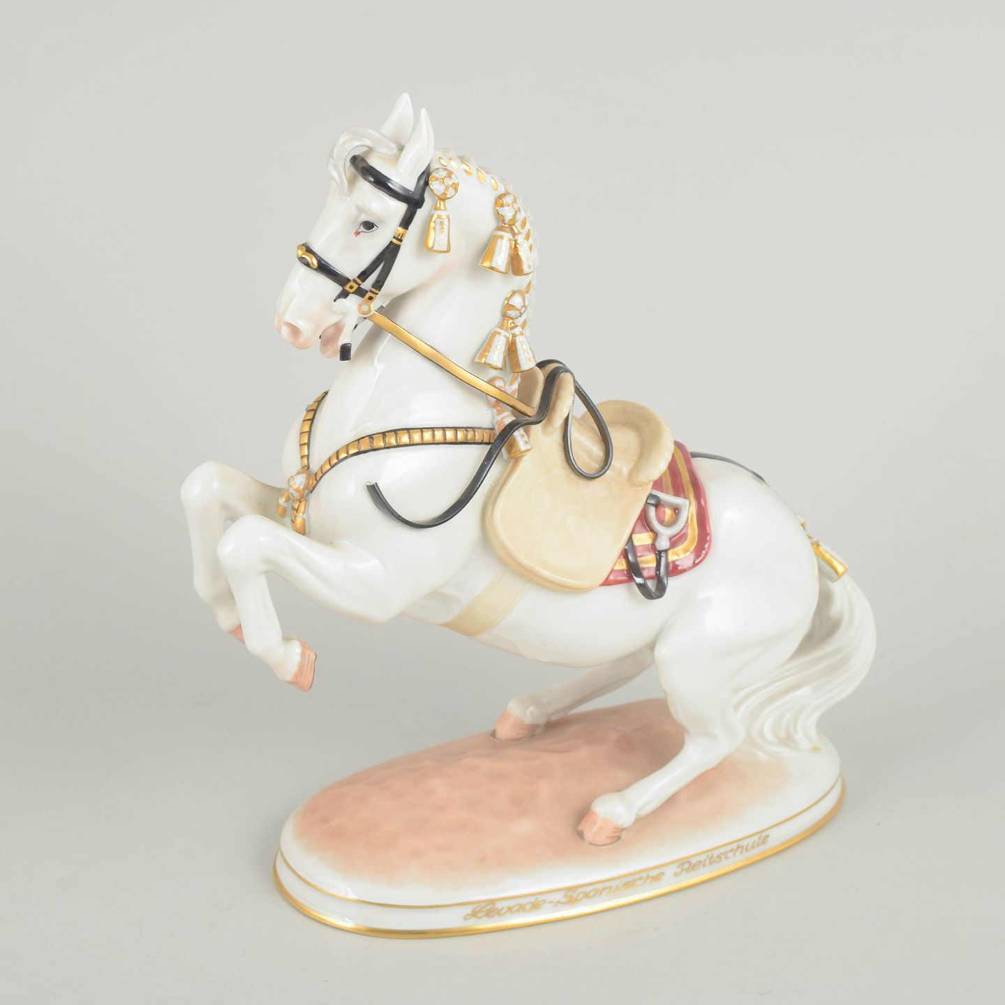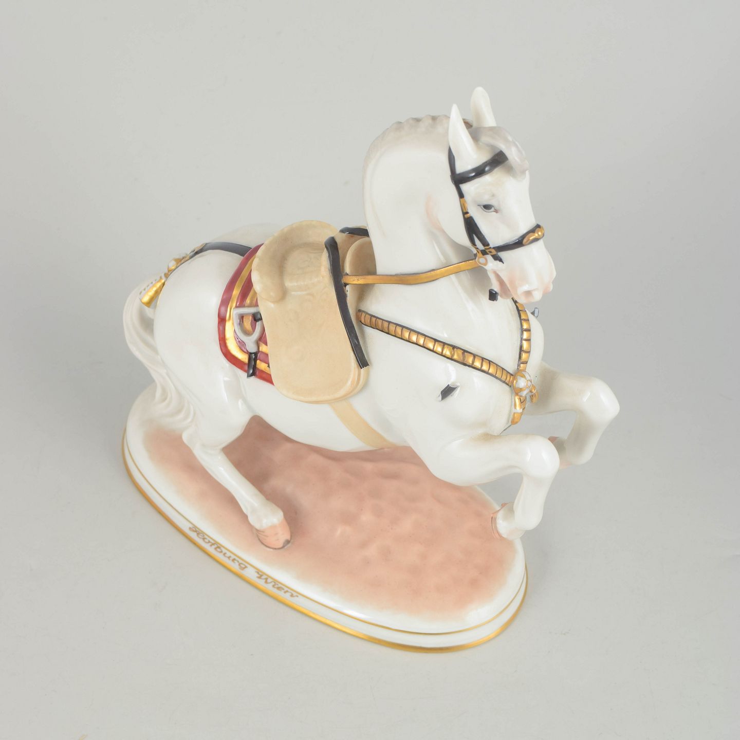 Finely modelled porcelain figure of a rearing horse with saddle and harness, decorated with delicate polychrome and gilt details. The “Hofburg” model, produced in Vienna and marked underneath.