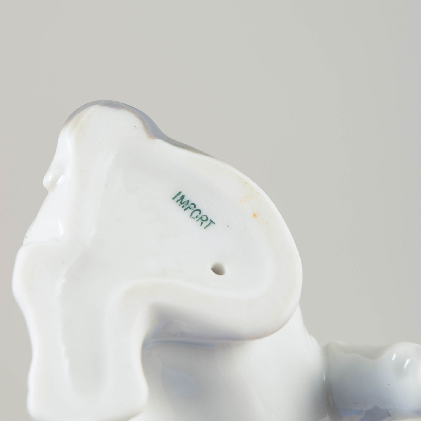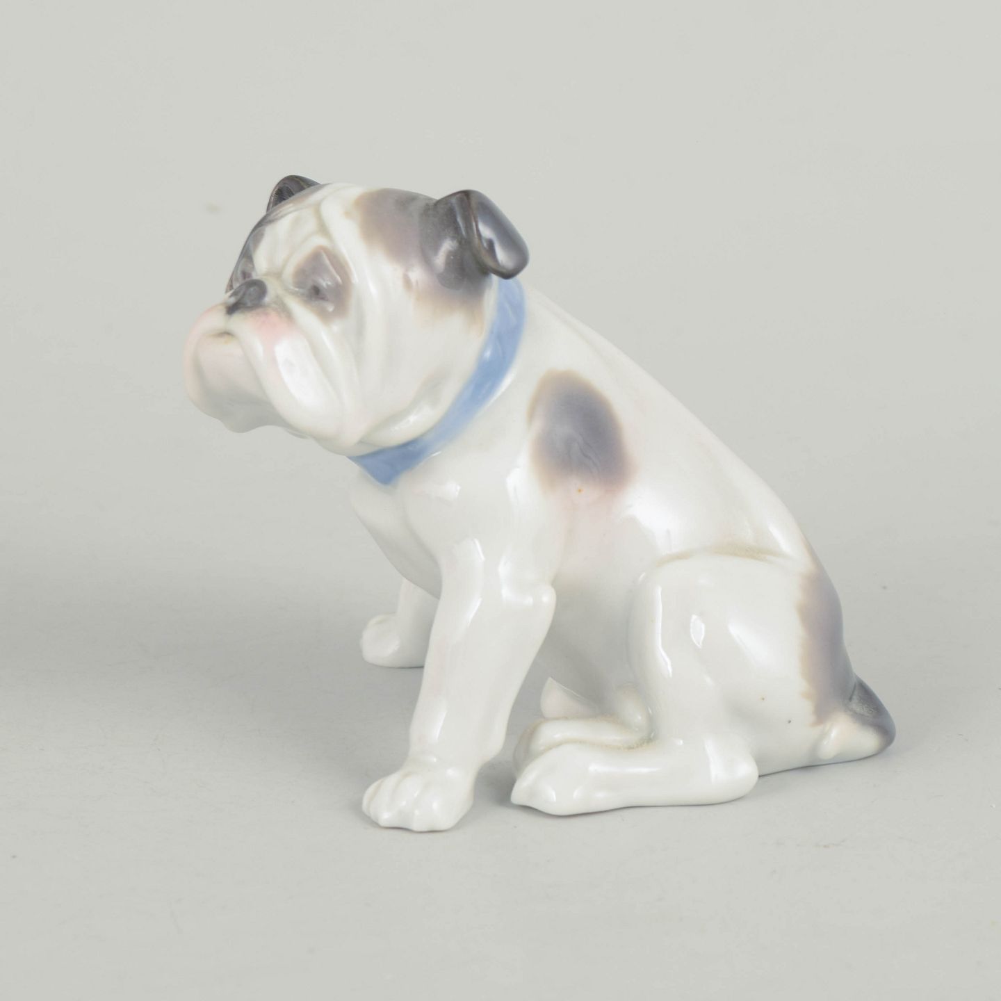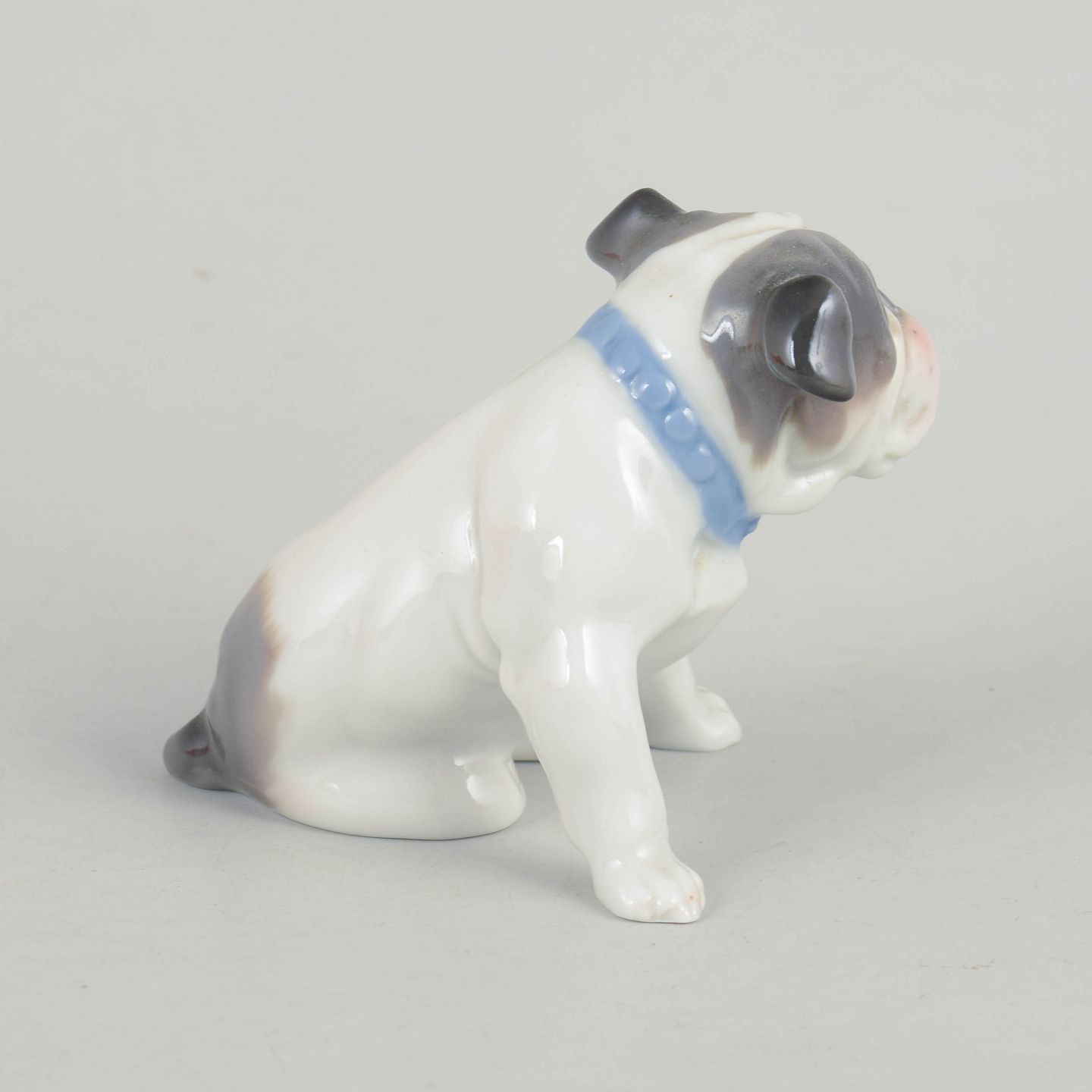 Naturalistically modelled porcelain figure of a French bulldog with hand-painted details in grey, white and pink tones.