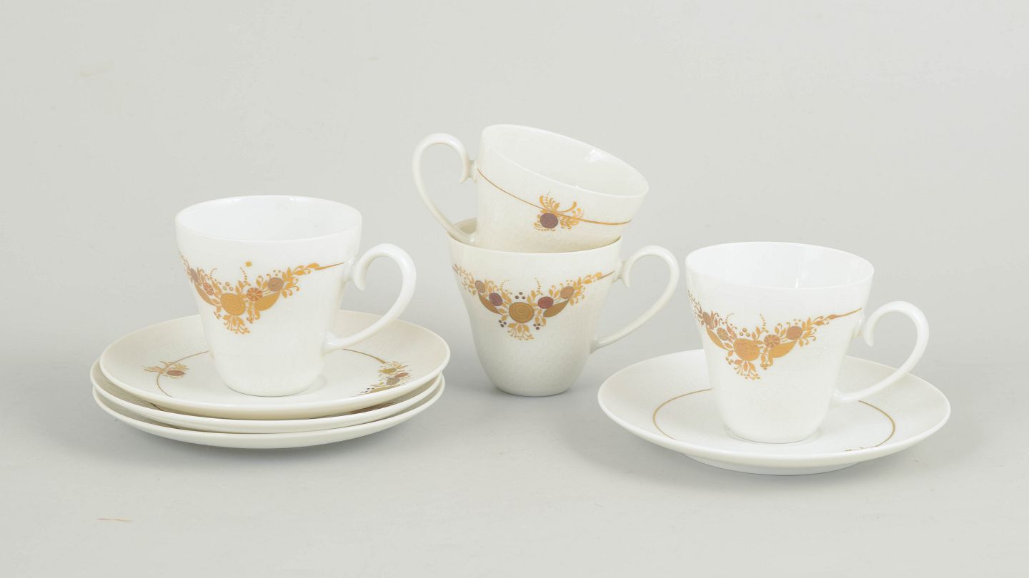 Set consisting of four coffee cups with matching saucers in porcelain decorated with the characteristic floral ornament from the Romanze series. The decoration appears in golden tones with fine detailing and an elegant, romantic expression, typical of Wiinblad’s design language in the 1970s.