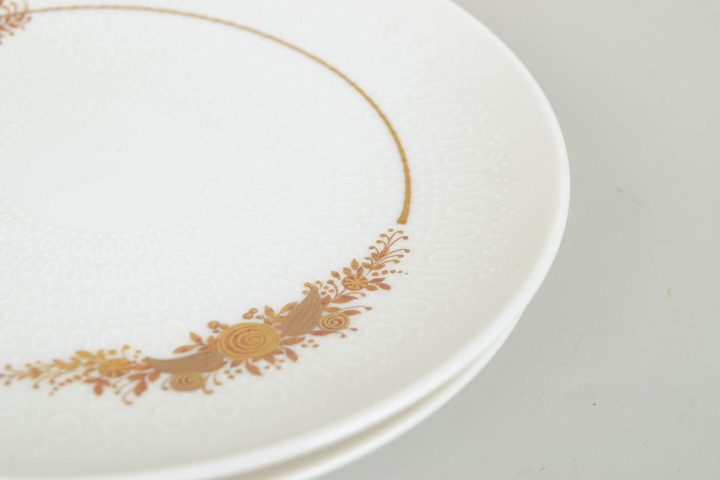 Set consisting of twelve cake plates in porcelain decorated with the characteristic floral ornament from the Romanze series. The fine decoration in golden tones appears elegant and detailed with a romantic expression, typical of Wiinblad’s design language in the 1970s.