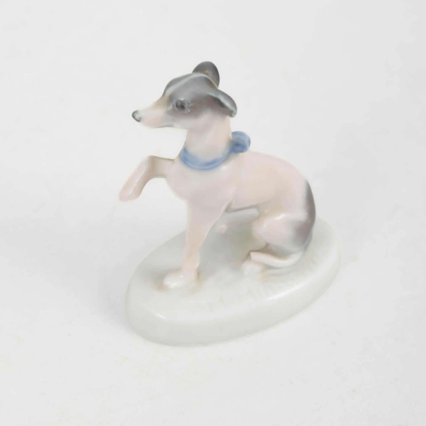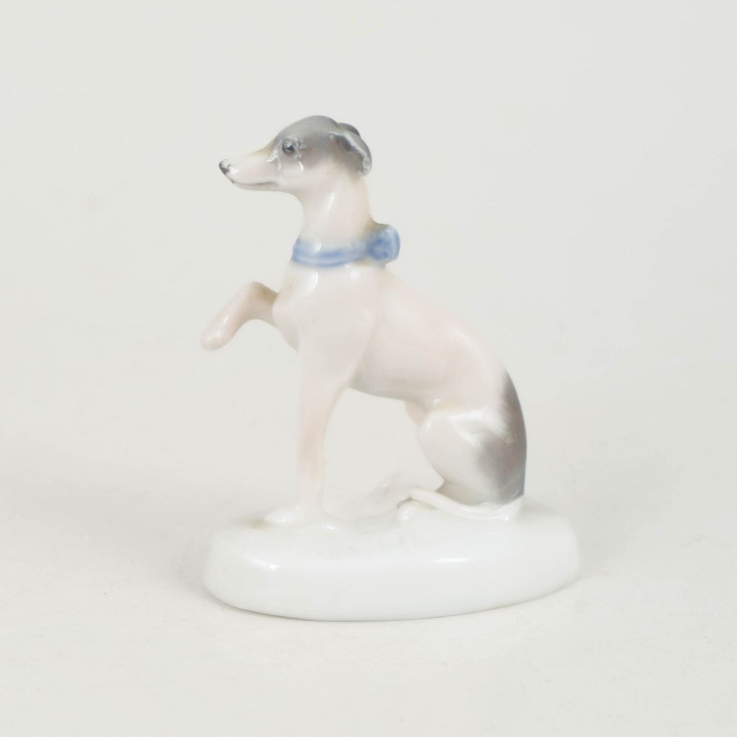 Fine naturalistic porcelain figurine of a seated greyhound with raised paw and an elegant slender form. Executed with soft glaze transitions in light tones and signed R. Sh., produced by Rosenthal around 1927.