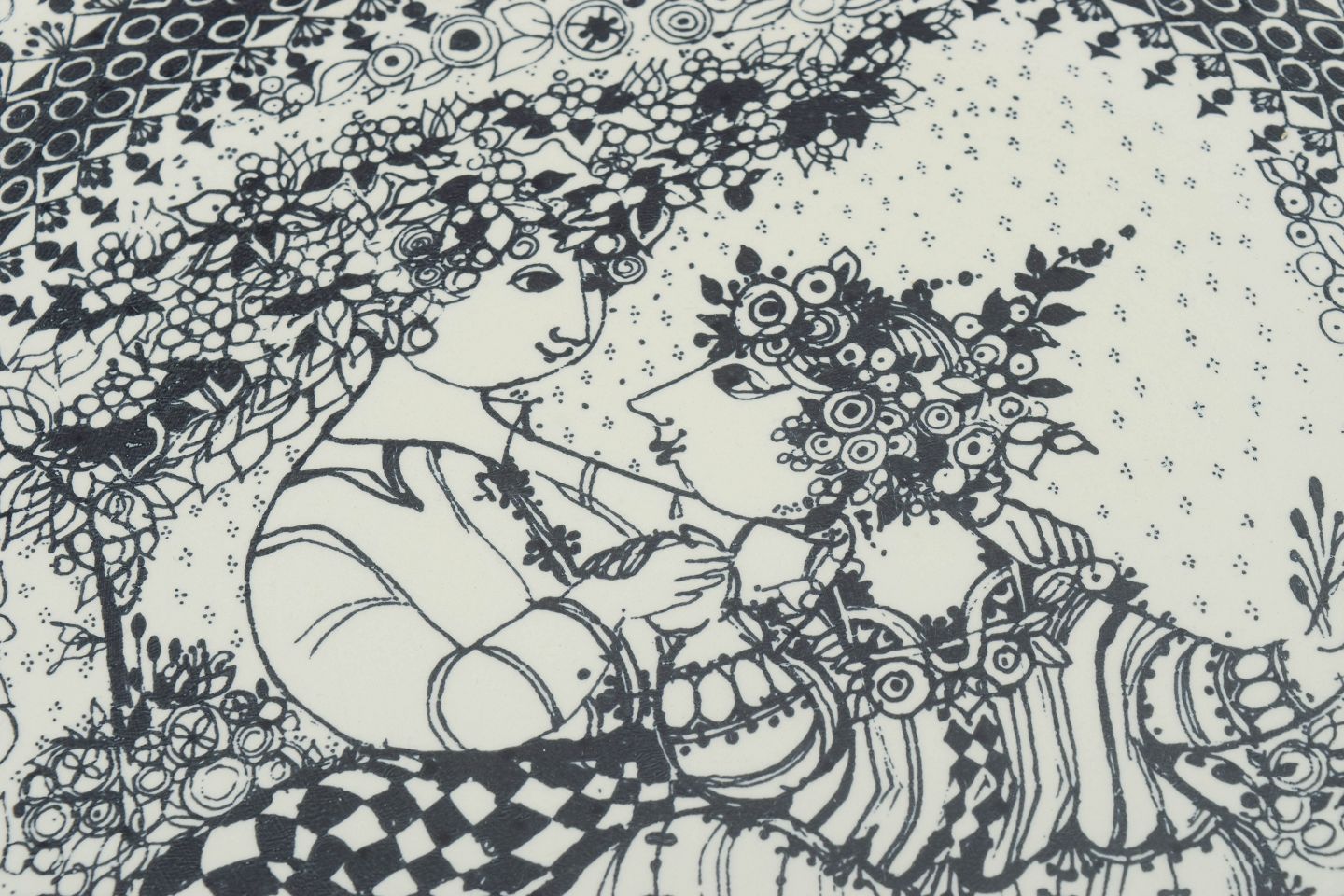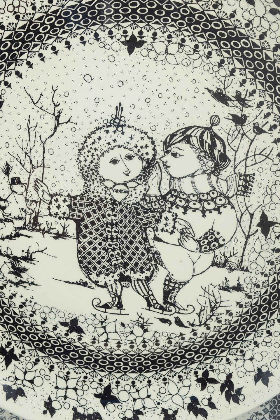Decorative round faience dishes with black line decoration in Bjørn Wiinblad’s characteristic whimsical style, featuring figurative scenes and ornamental borders. The motifs represent the seasons winter and spring.