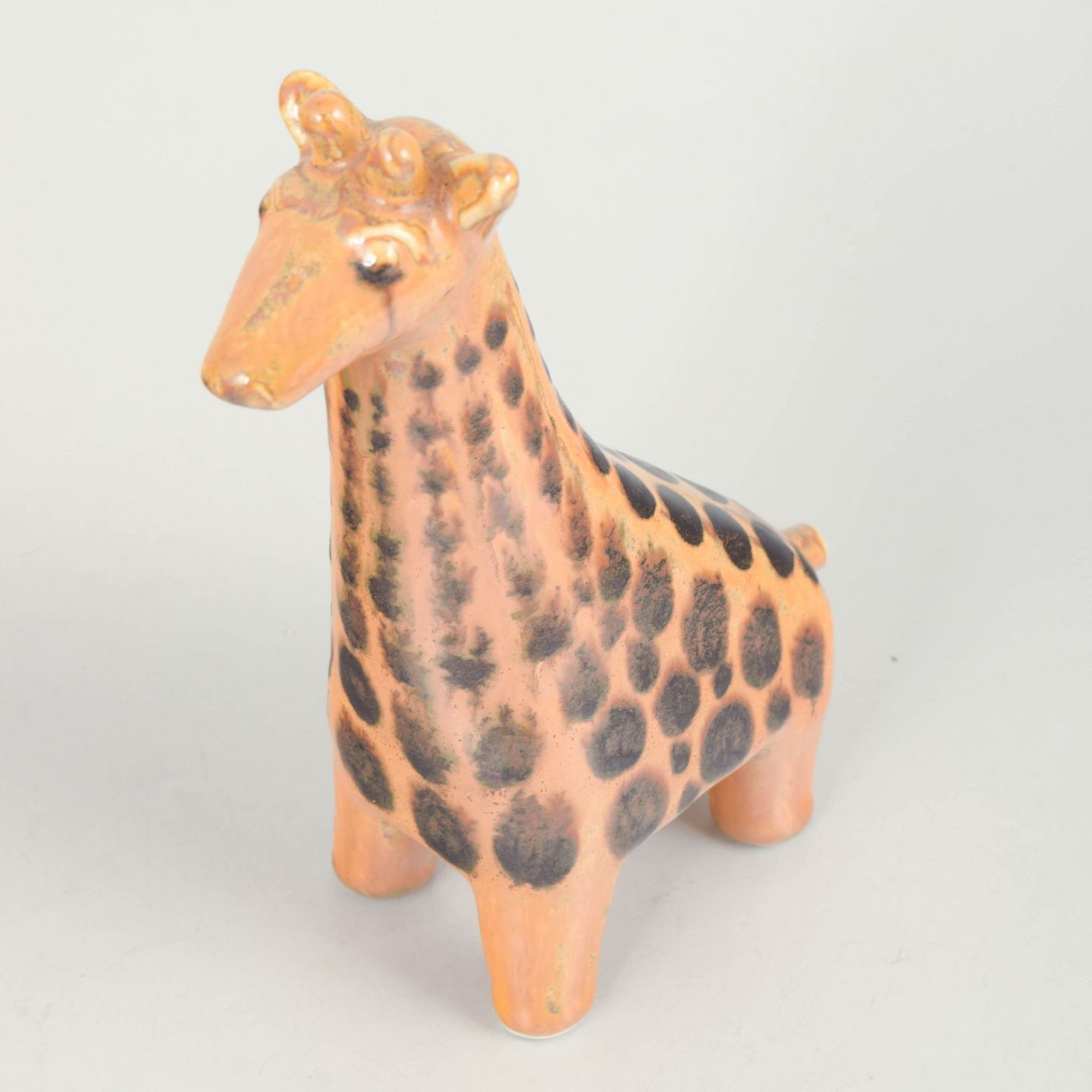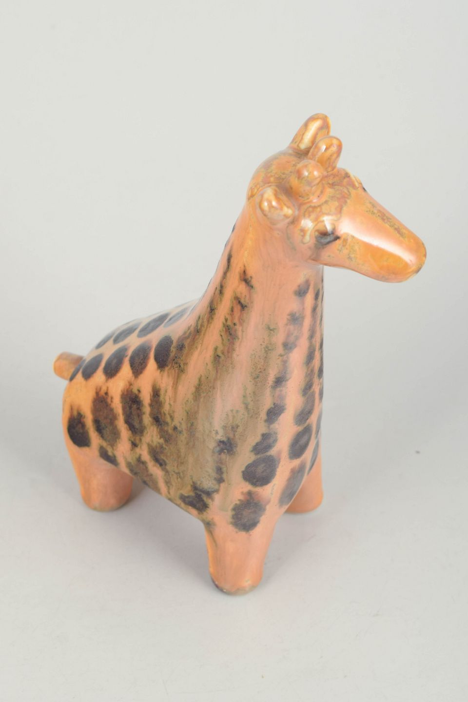 Decorative ceramic figure shaped as a giraffe with a stylised form and hand-painted dark spots on a warm orange glaze. A characteristic example of Swedish design from the period.
