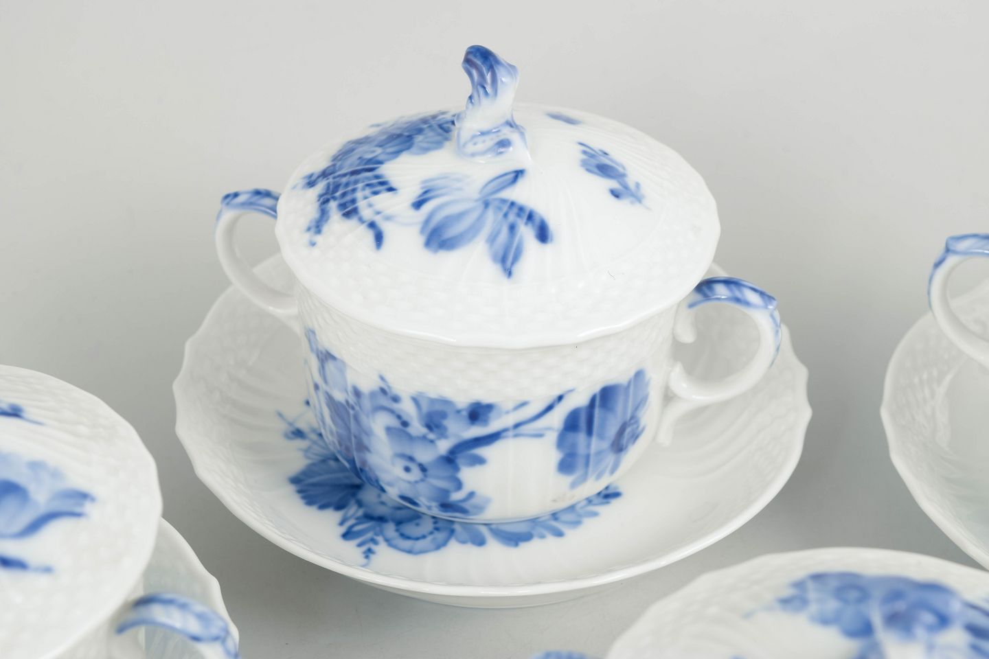 Rare set of lidded bouillon cups in porcelain, decorated in the classic hand-painted Blue Flower Curved pattern. Model 10/1552, first factory quality, dated 1962.