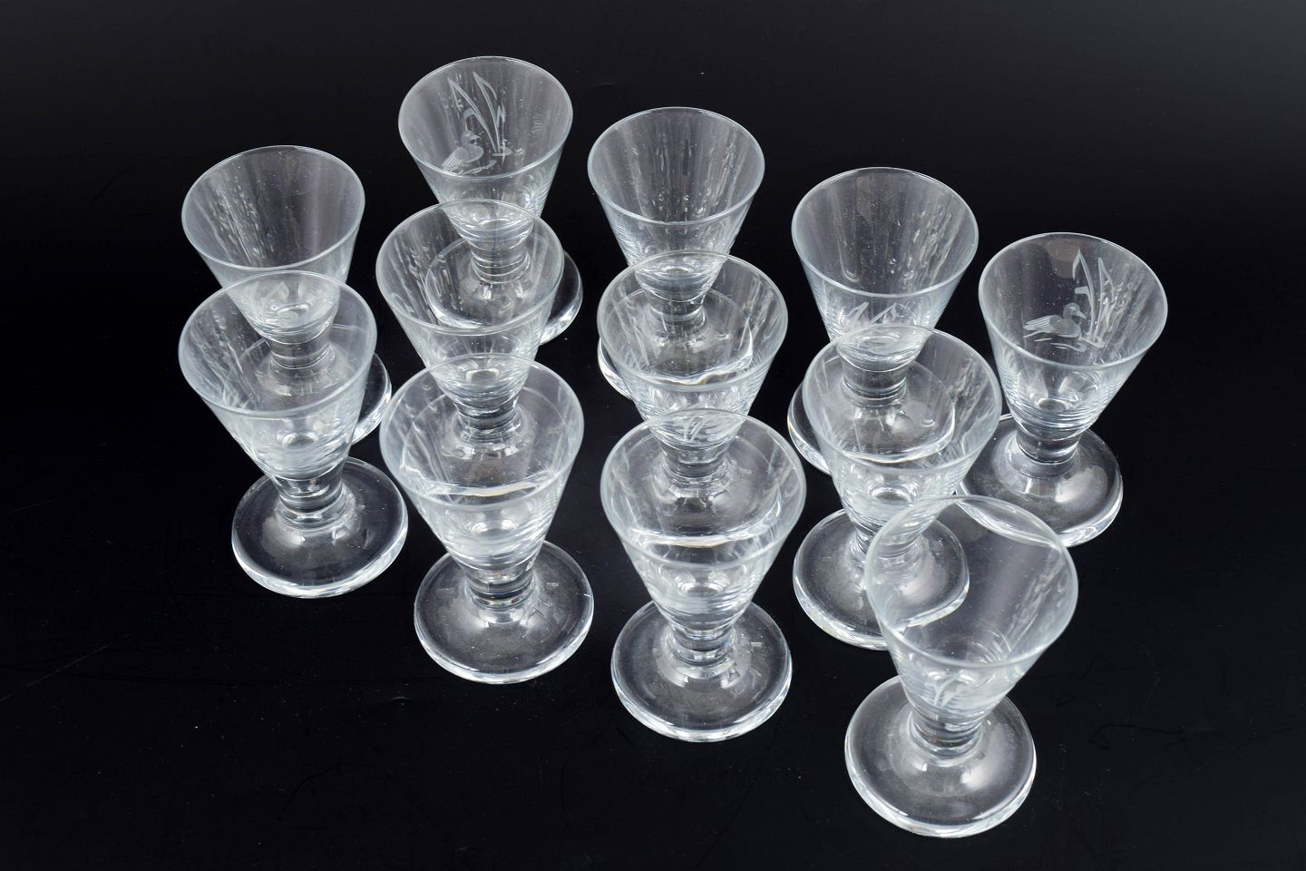 Scandinavian glassworks, set of twelve schnapps glasses with duck and reed motif.