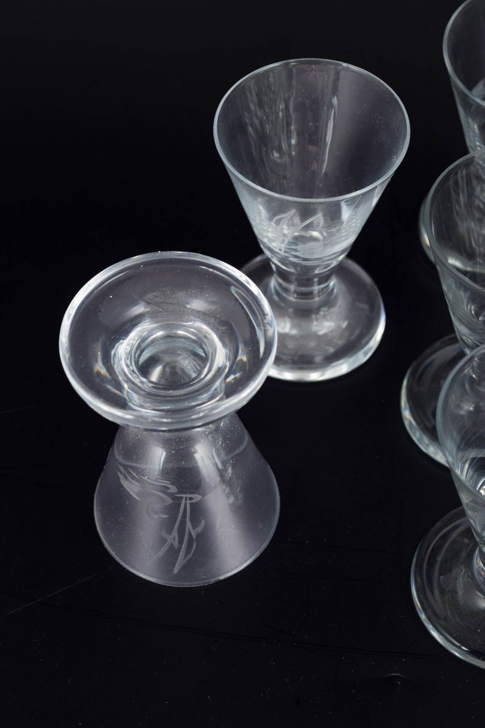 Mouth-blown schnapps glasses with engraved decoration of ducks and reeds in clear glass, executed in a classic interwar style with conical bowl and solid foot.