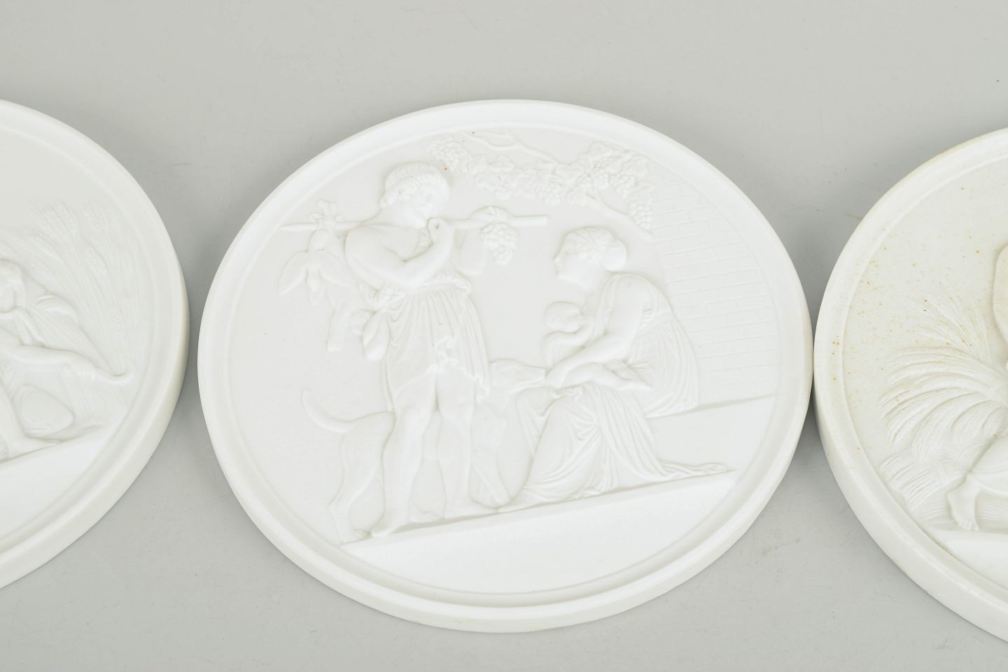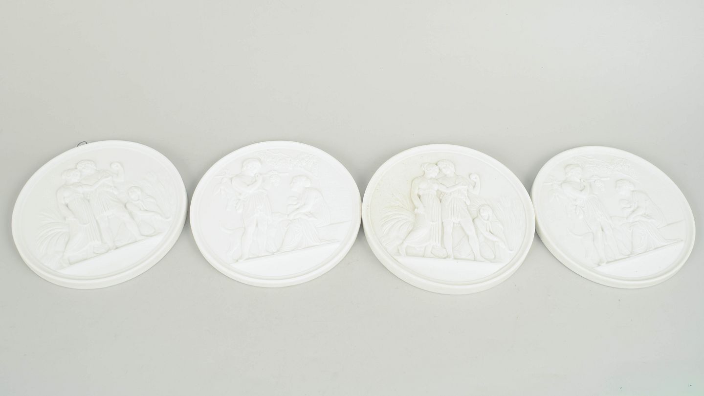 White unglazed porcelain reliefs with classical motifs after Bertel Thorvaldsen, executed in fine biscuit with detailed figural decoration and suspension mounts on the reverse. First factory quality.