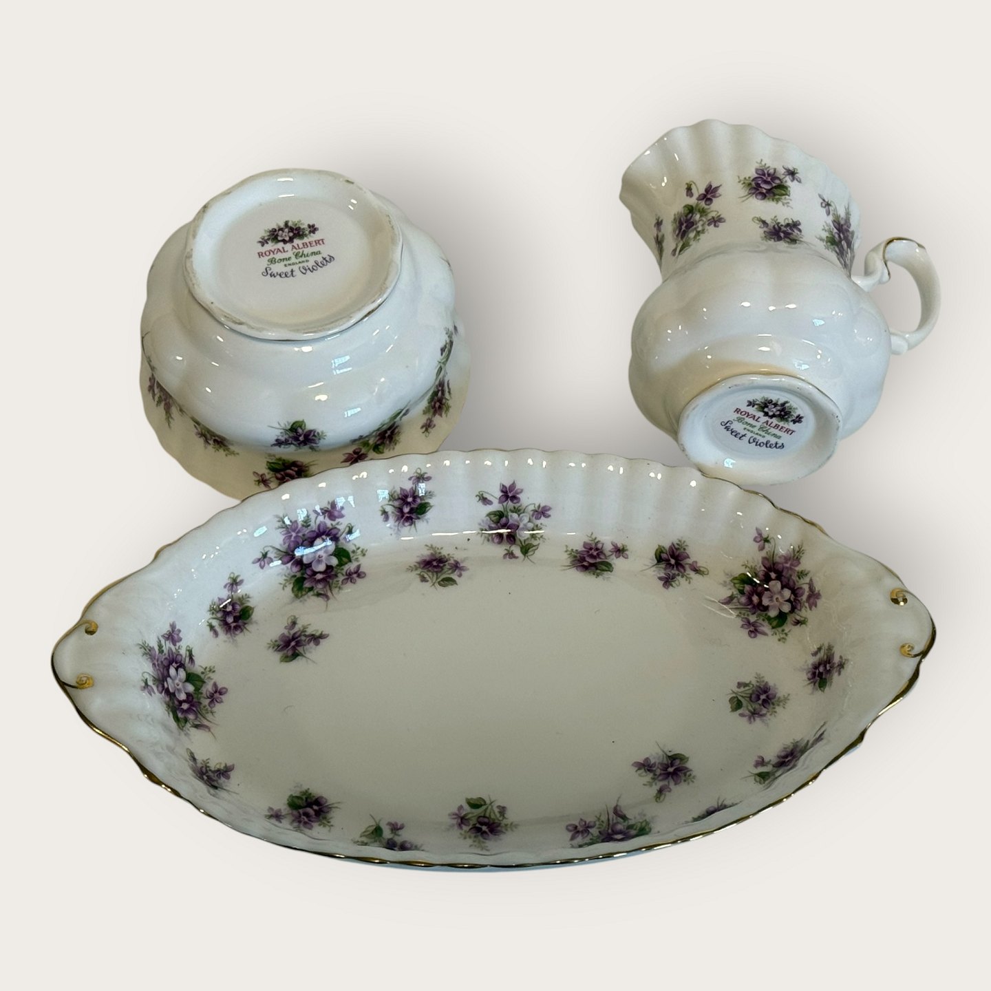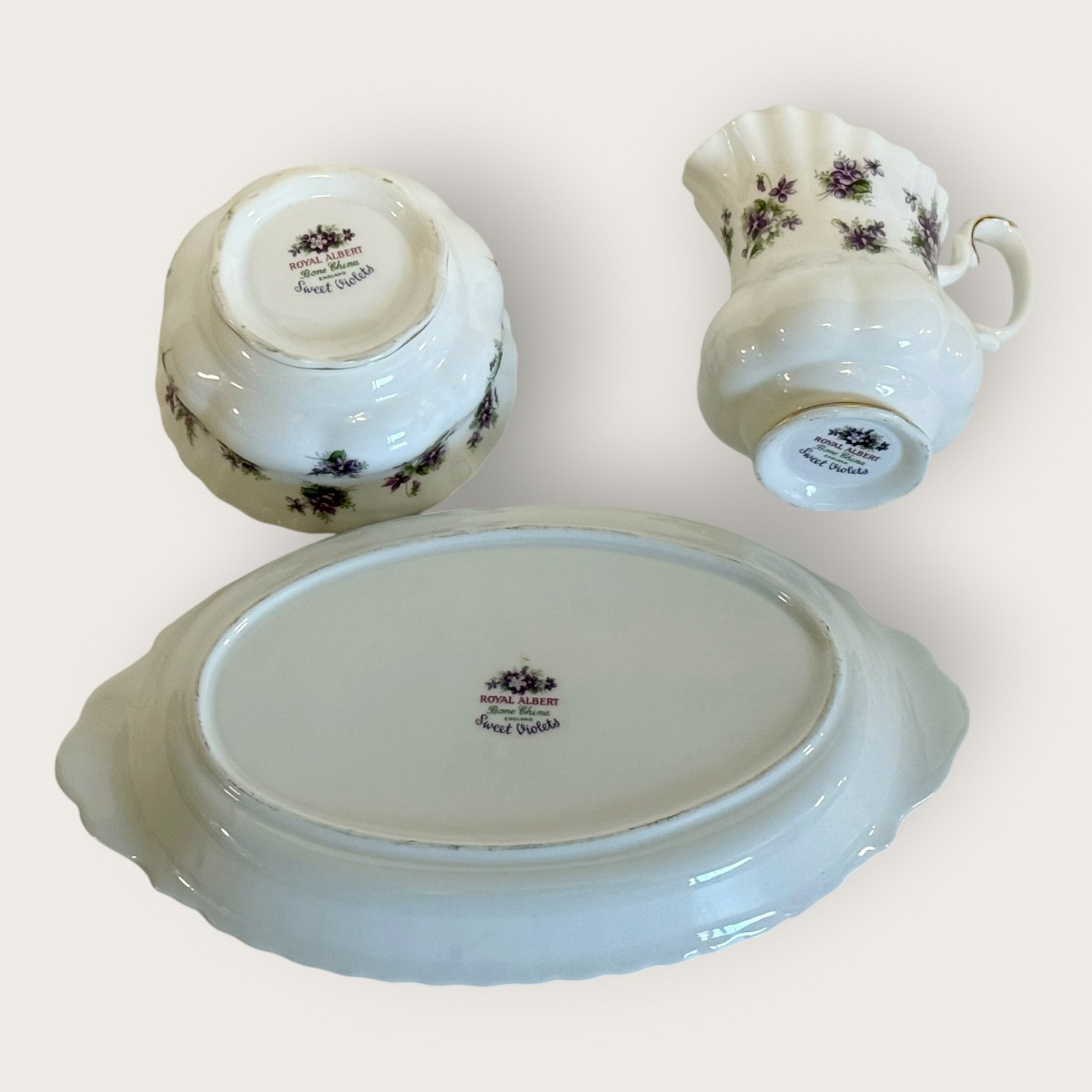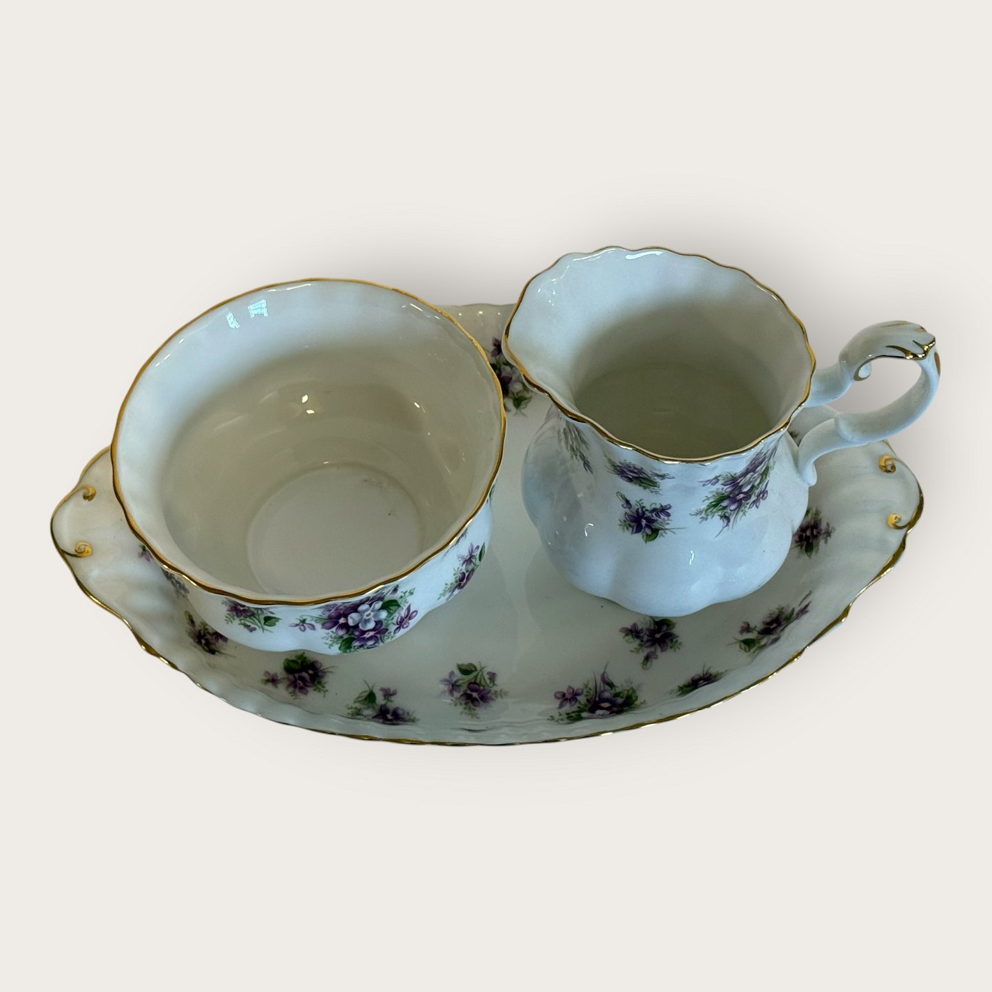 Royal Albert, Bone China, Sweet violets, Field violet, Sugar, cream set on small tray, tray measures 22x13cm *Perfect condition*