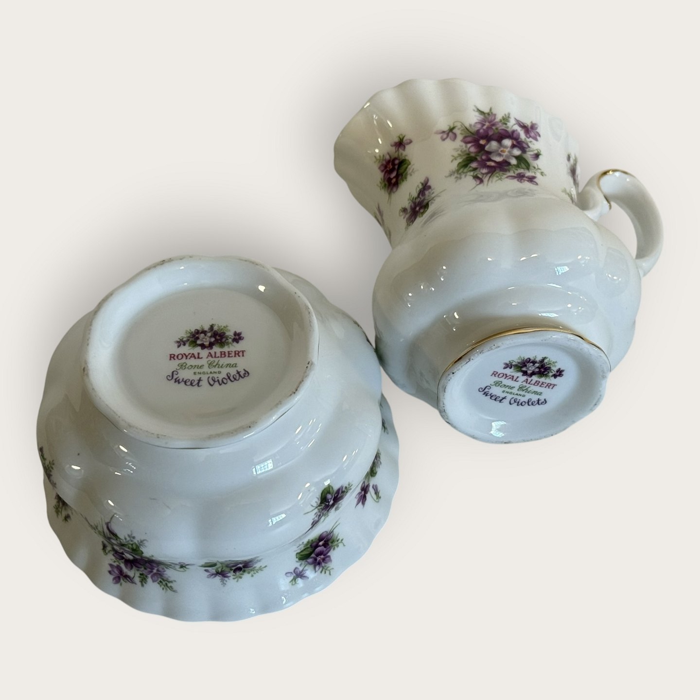 Royal Albert, Bone China, Sweet violets, Field violet, Sugar, cream set, sugar bowl diameter 9cm, creamer height 9cm *Perfect condition*