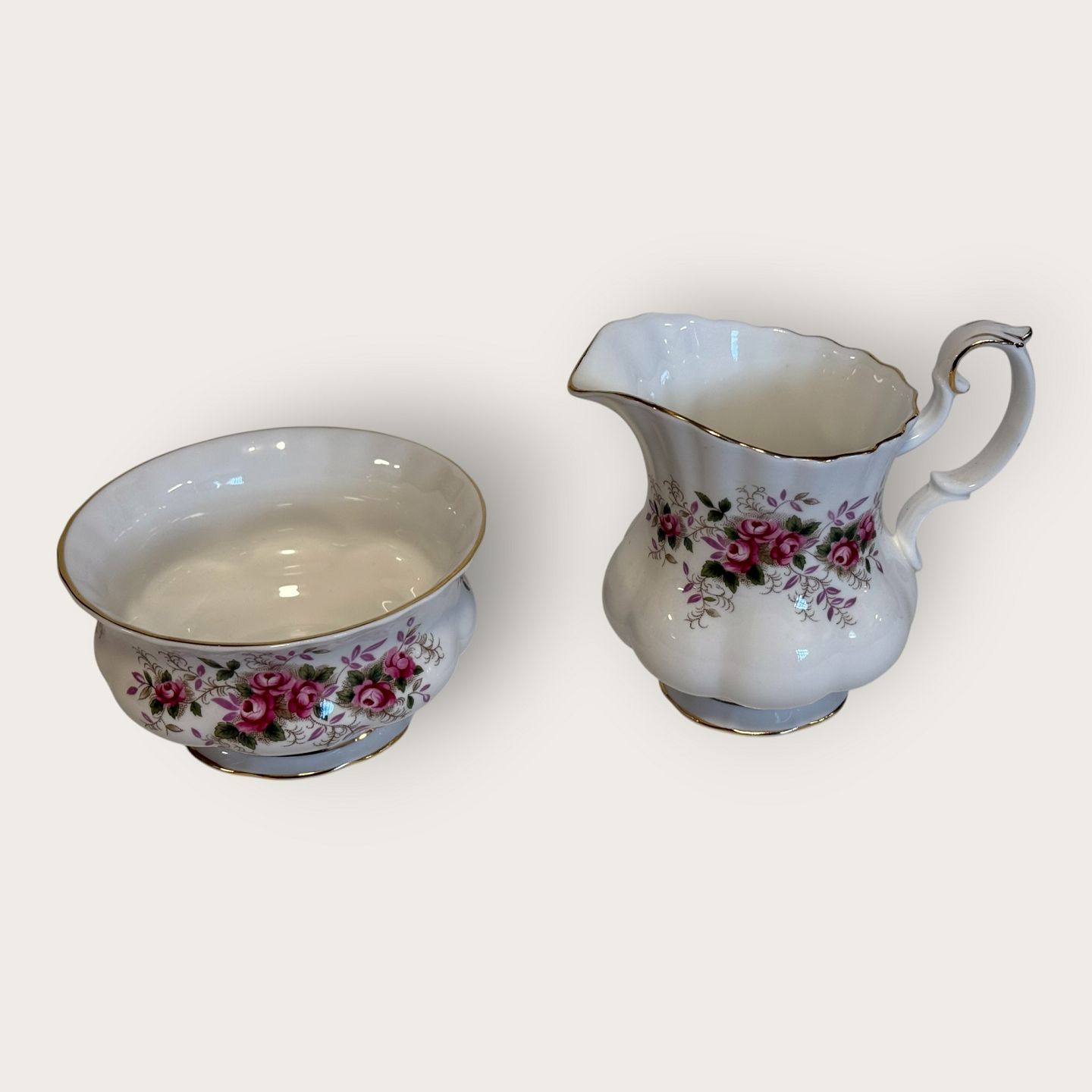Royal Albert, Bone China, Lavender Rose, Large Sugar and Cream Set, sugar bowl height 6cm, diameter 11cm, creamer approx. hxwxl 10.5x12x8.5cm *Perfect condition*