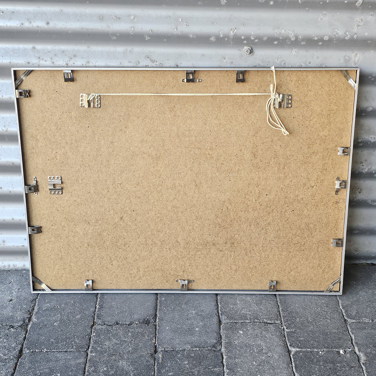 Oliekridt maleri på papir med motiv af en lyshåret og en mørkhåret kvinde. Monteret i metalramme, dateret 1996